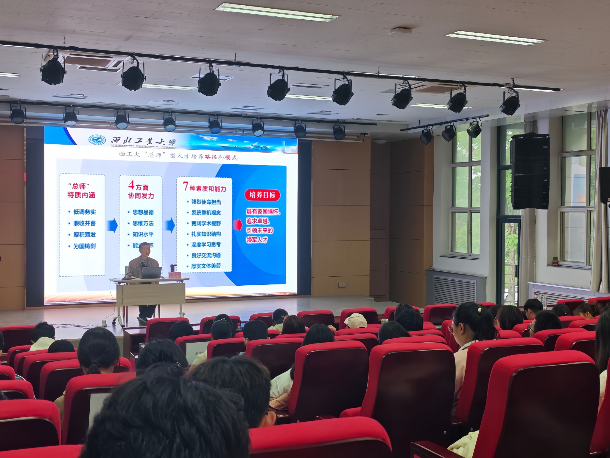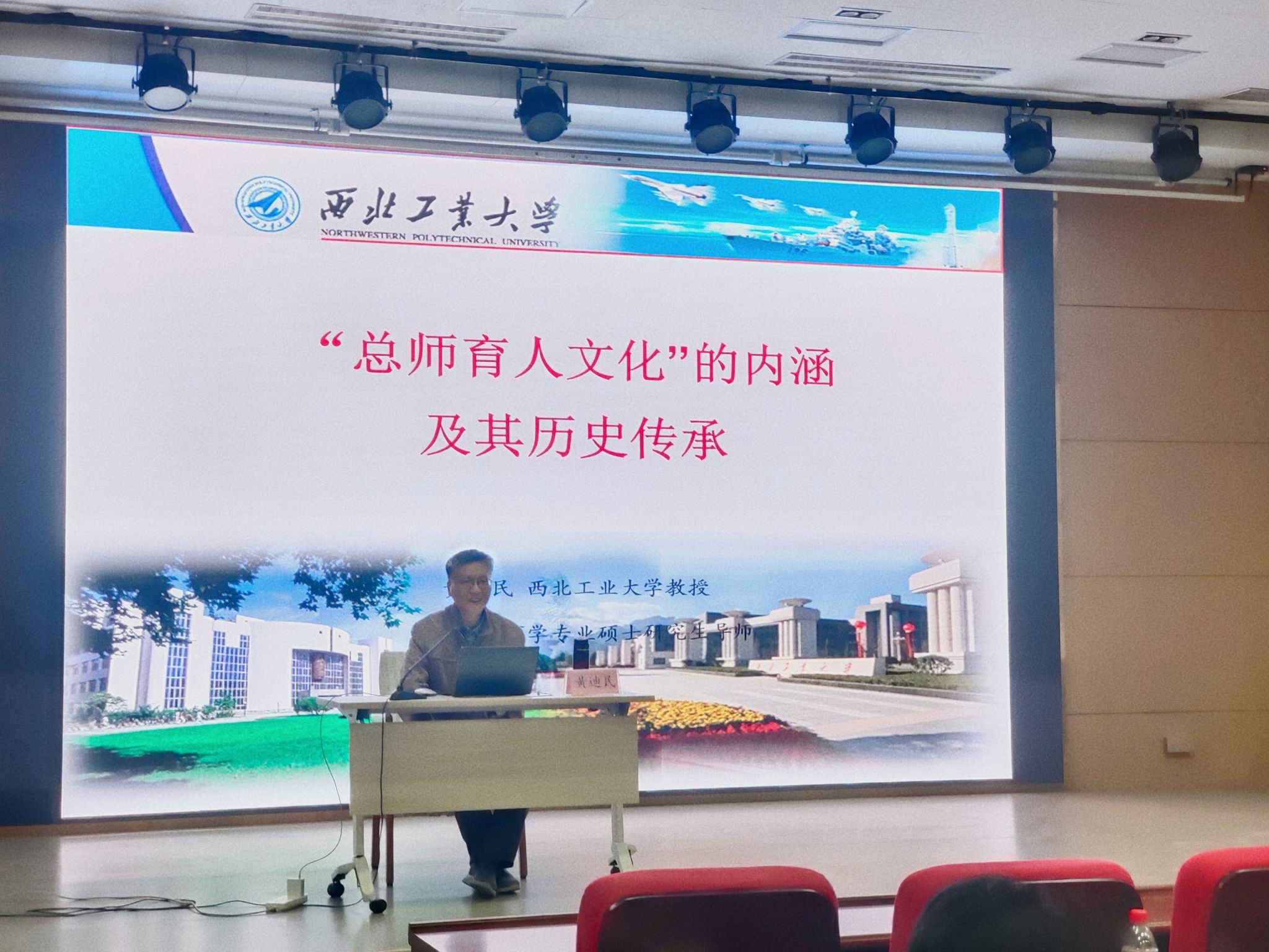 黄迪民首先介绍了现代大学的功能与大学文化,指出“总师育人文化”是西北工业大学在长期教学实践中形成的办学理念和校园精神。他强调,西工大作为“总师摇篮”,肩负着“育国之栋梁、铸国之重器”的历史使命,坚持为党育人、为国育才,形成了特色鲜明的国防科技人才自主培养模式。
