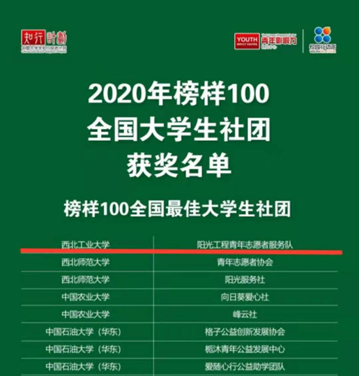 2020年“知行计划”榜样100全国大学生社团年度表彰名单近日出炉,由管理学院指导的“阳光工程”青年志愿者服务队喜获“榜样100全国最佳大学生社团”。