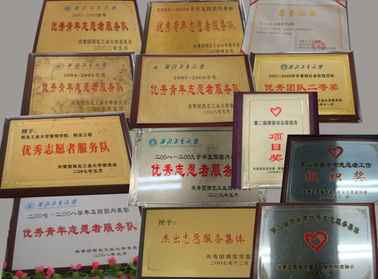 22年来,先后荣获“中国杰出志愿服务集体”“陕西省学雷锋先进集体”“全国高校优秀学生团队”“陕西青年志愿者优秀项目奖”“陕西省高校最佳服务项目”“西安市杰出服务集体”,多次获得西北工业大学“最美青年志愿者服务队”等荣誉。