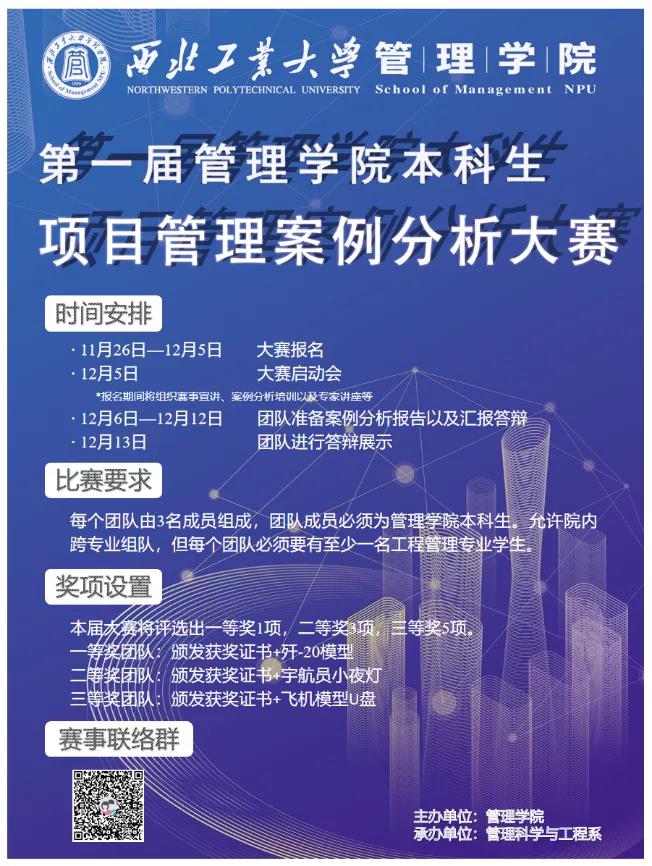 为激发广大学生学习项目管理理论,关注工程管理实践的热情,营造独立思考、自由探索、勇于创新的良好环境,管理学院特主办了第一届本科生项目管理案例分析大赛,由管理科学与工程系承办。本次大赛自11月26日发布以来,得到了同学们的踊跃报名,一共有多达24支队伍报名参赛,经过激烈角逐,比赛于12月13日顺利落下帷幕。