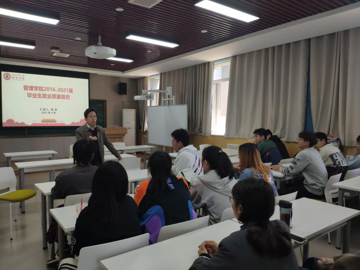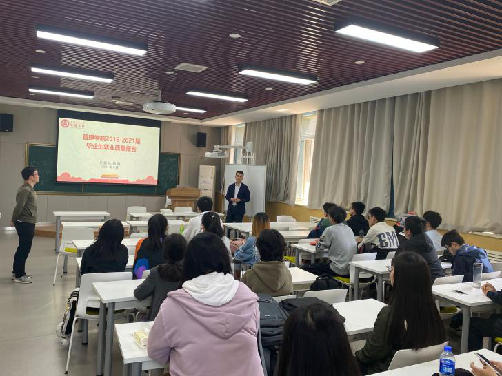 首先樊琳老师为同学们介绍了近几年来管理学院的升学、就业等情况,增强了同学们对未来求学和就业的信心,同时介绍了学院各种为同学们提供指导与帮助的政策,并对未来升学或者就业的形势做了分析。