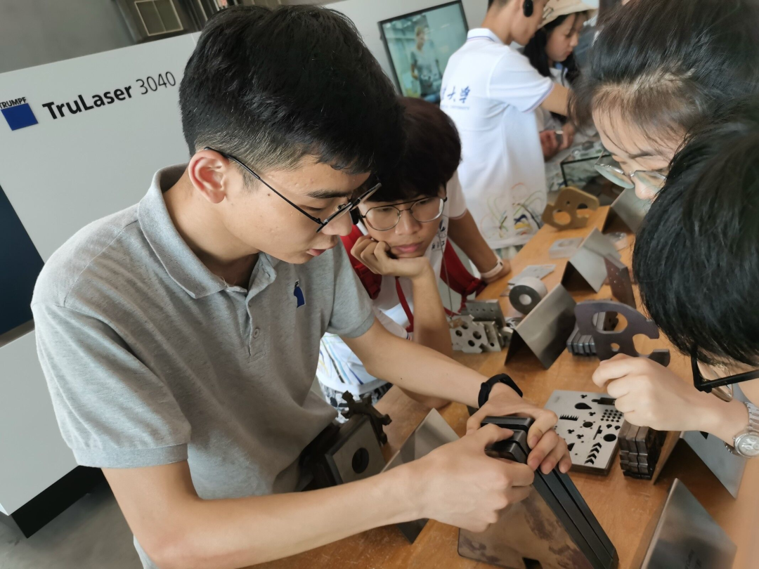在产品经理的带领下,实践队对通快公司正在使用的ERP 企业管理系统、正在追求的工业4.0发展模式等生产方式有了一定的了解。随后我们参观了通快公司的展厅,了解到了通快(中国)有限公司的发展历史,近距离观看到以“自动化+智能机器人”为基础而实现的折弯技术、激光切割技术等。为了能让同学们更好地体验到自动化生产的魅力,通快(中国)有限公司还为同学们赠送了利用激光切割实现的小车模型,同学们在动手制作中体会到了通快先进科技带来的方便快捷。