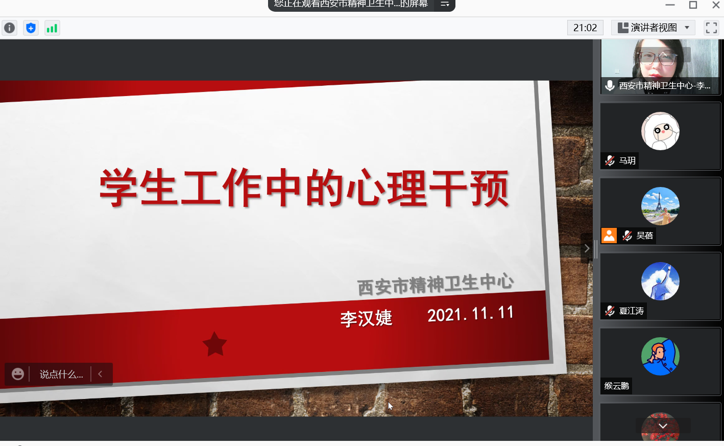 2021年11月11日晚,管理学院于线上顺利开展了题为“学生工作中的心理干预”专题培训活动。西安市精神卫生中心李汉婕老师受邀担任主讲人,管理学院全体专职与兼职辅导员参加了此次集体学习。