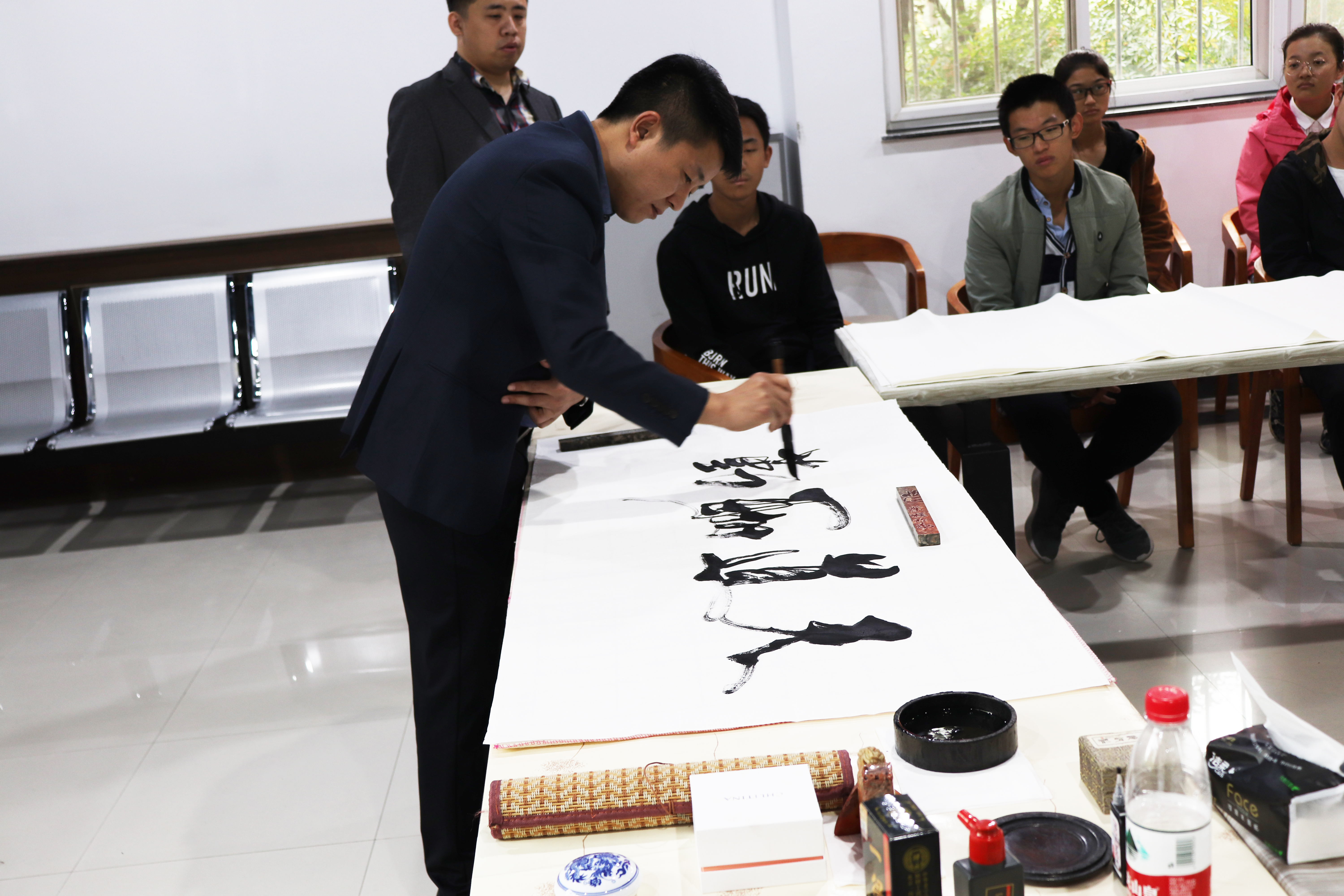 首先,余康校友以“天道酬勤”这四个字开篇,向到场同学们展示了书法中蕴含的人生道理。接下来,他阐述了自己理解的书法真谛。即书法是表达作者情绪的途径,是作者与读者产生共鸣的一种媒介,书法的表现形式也是多种多样,每个人都有自己不同的理解和风格。而一幅“公诚勇毅”的作品,则表现出校友对母校80周年华诞的美好祝福。