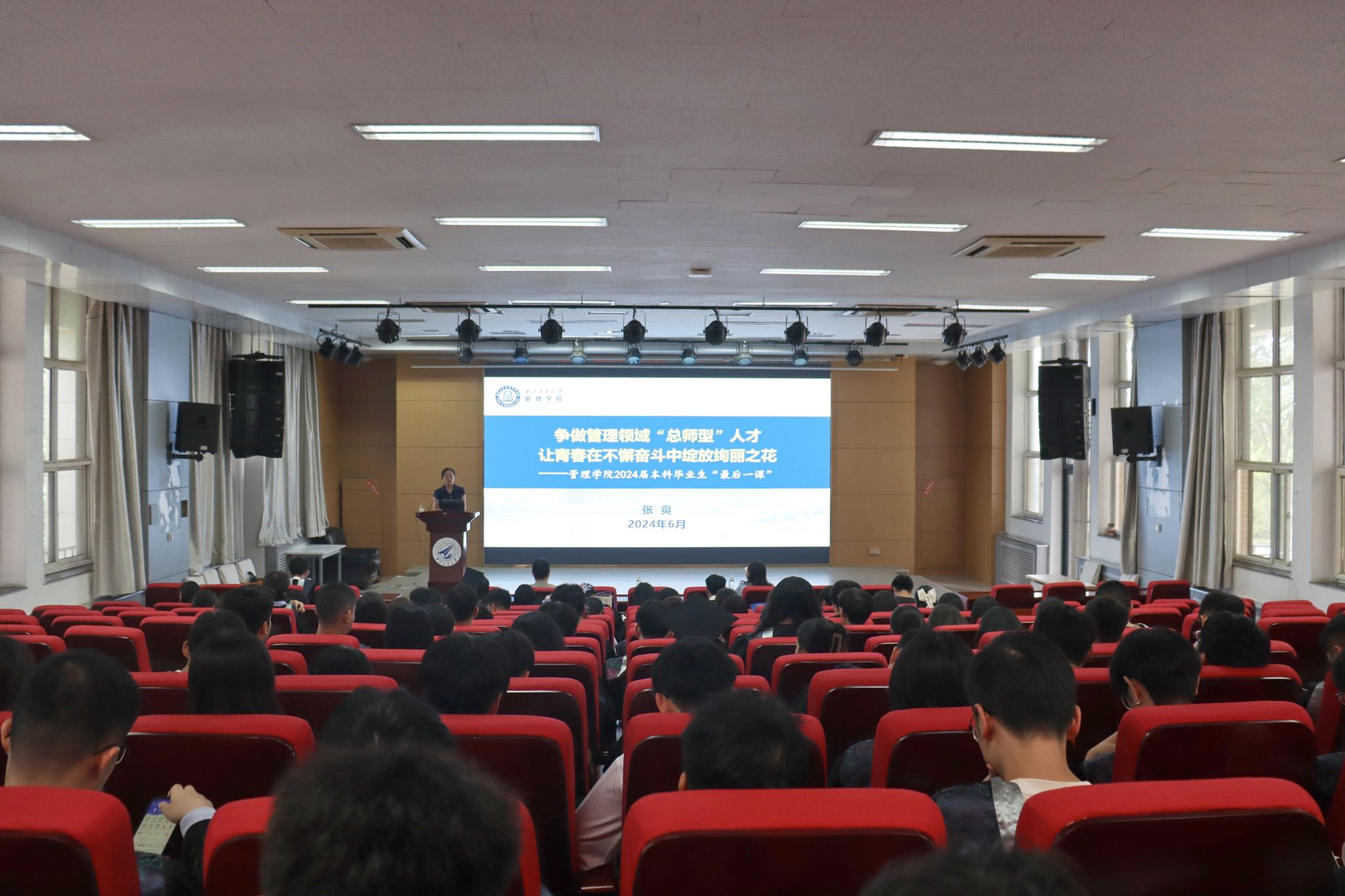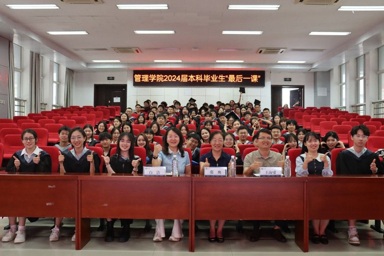 6月19日下午, 管理学院党委书记张爽为2024届本科生讲授以《争做管理领域“总师型”人才,让青春在不懈奋斗中绽放绚丽之花》为题的“最后一课”。本次活动由学院党委副书记王海啸主持,院长助理白洁、毕业年级辅导员和全体本科毕业生参加。