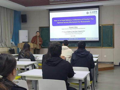 2023年11月9日,应管理学院邀请,天津大学管理与经济学部王钟彬副教授来学院开展学术交流,做题为“Dine-in or Food Delivery: A Dilemma of Priority?The Optimal Service Mechanism for Restaurants顾客堂食还是配送到家:孰轻孰重?餐厅最优的服务机制研究”的学术报告。本次报告由李纪柳教授主持,管理学院部分教师和研究生参与。