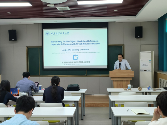 会议伊始,王阳教授对吴俊杰教授的专业背景、科研成果做了简单介绍。管理学院师生对吴教授的到来表示了热烈的欢迎。此次报告会,吴教授介绍了如何在经典的前景理论指导下,采用数据驱动的方式,对参考点依赖的消费者选择行为进行深度学习,并据此设计推荐系统ArcRec。首先,介绍如何从消费者历史购买记录中构建商品属性级别的参考网络,从而可以建模消费者细粒度的参考效应。其次,基于图神经网络构建了参考点依赖的效用函数,同时量化了消费者兴趣驱动和价格驱动的复杂偏好,并且引入商品属性级别的支付意愿指标来捕捉消费者的价格敏感性。在此基础上采用数据驱动的方式,对参考点依赖的消费者选择行为进行深度学习,从而提出了推荐系统ArcRec。最后,通过仿真实验与真实场景数据验证,证明该推荐系统的可解释性以及在推荐精度上的显著提升。此外,吴教授结合研究实例,分享了管理类顶级期刊的投稿经验。
