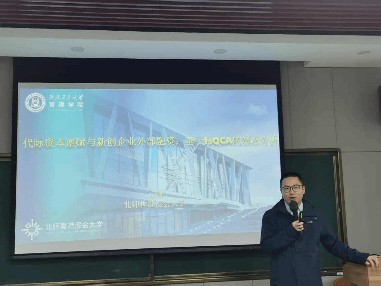 11月18日上午,应管理学院邀请,北师香港浸会大学工商管理学院王鹏副教授在长安校区学院楼214报告厅与学院师生展开学术交流,作题为“代际资本禀赋与新创企业外部融资:基于fsQCA的组态分析”的学术讲座。本次讲座由管理学院肖振鑫教授主持,学院部分教师和研究生参加。