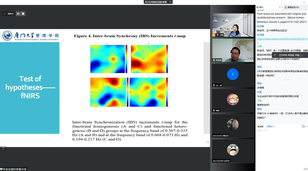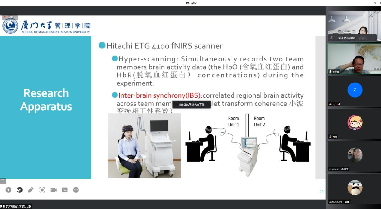5月13日上午10时,应管理学院邀请,厦门大学陈亚盛教授作了题为“专业技能多样性对虚拟团队创造力的影响——一项基于功能性近红外超扫描的实验”的报告,报告会由管理学院副教授王娟主持,校内外百余名师生参与报告会。