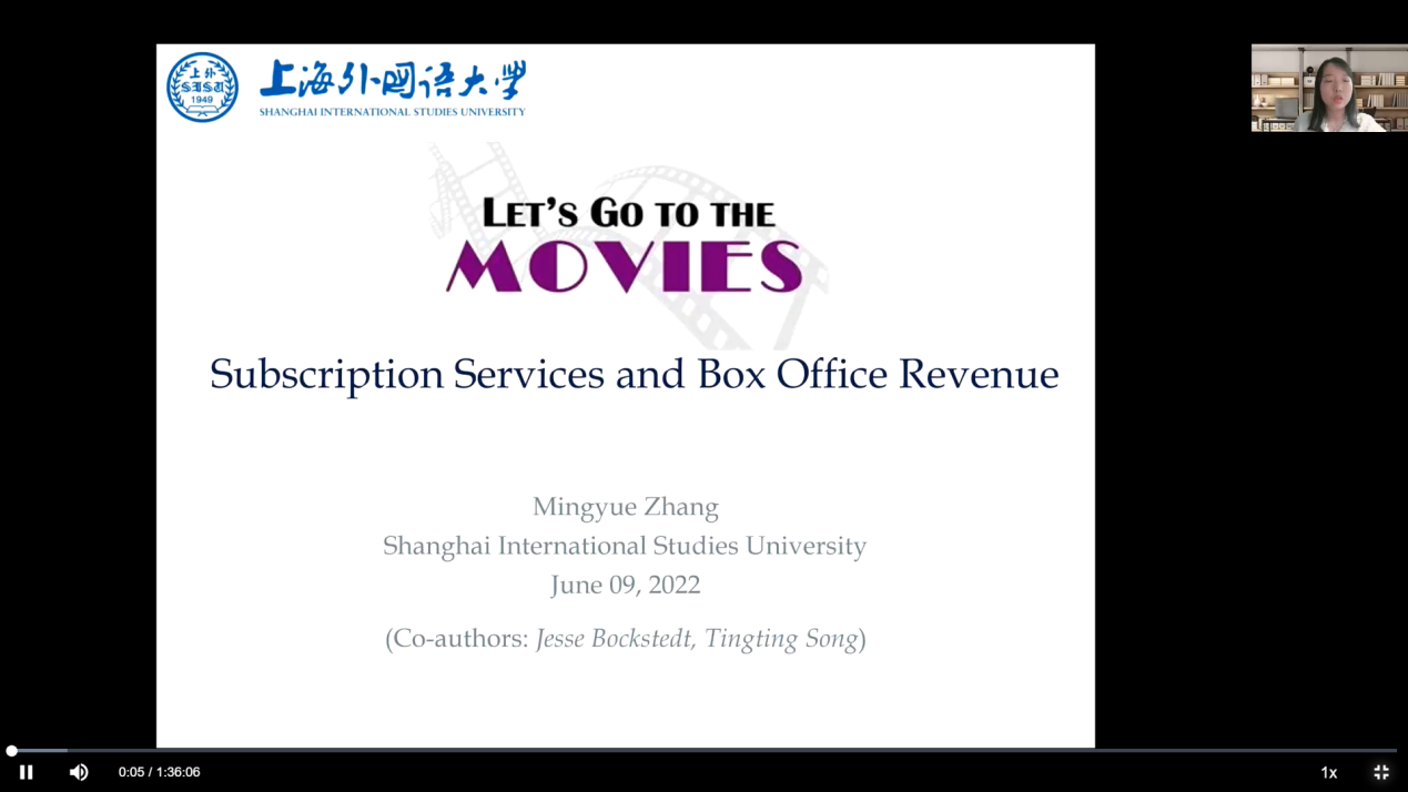 6月9日下午14:30,上海外国语大学国际工商管理学院的副教授张明月应邀为管院师生作了“Let’s go to the movies: subscription services and box office revenue”线上主题报告。报告会由董雪艳助理教授主持,管理学院多名师生参加了此次线上报告会。