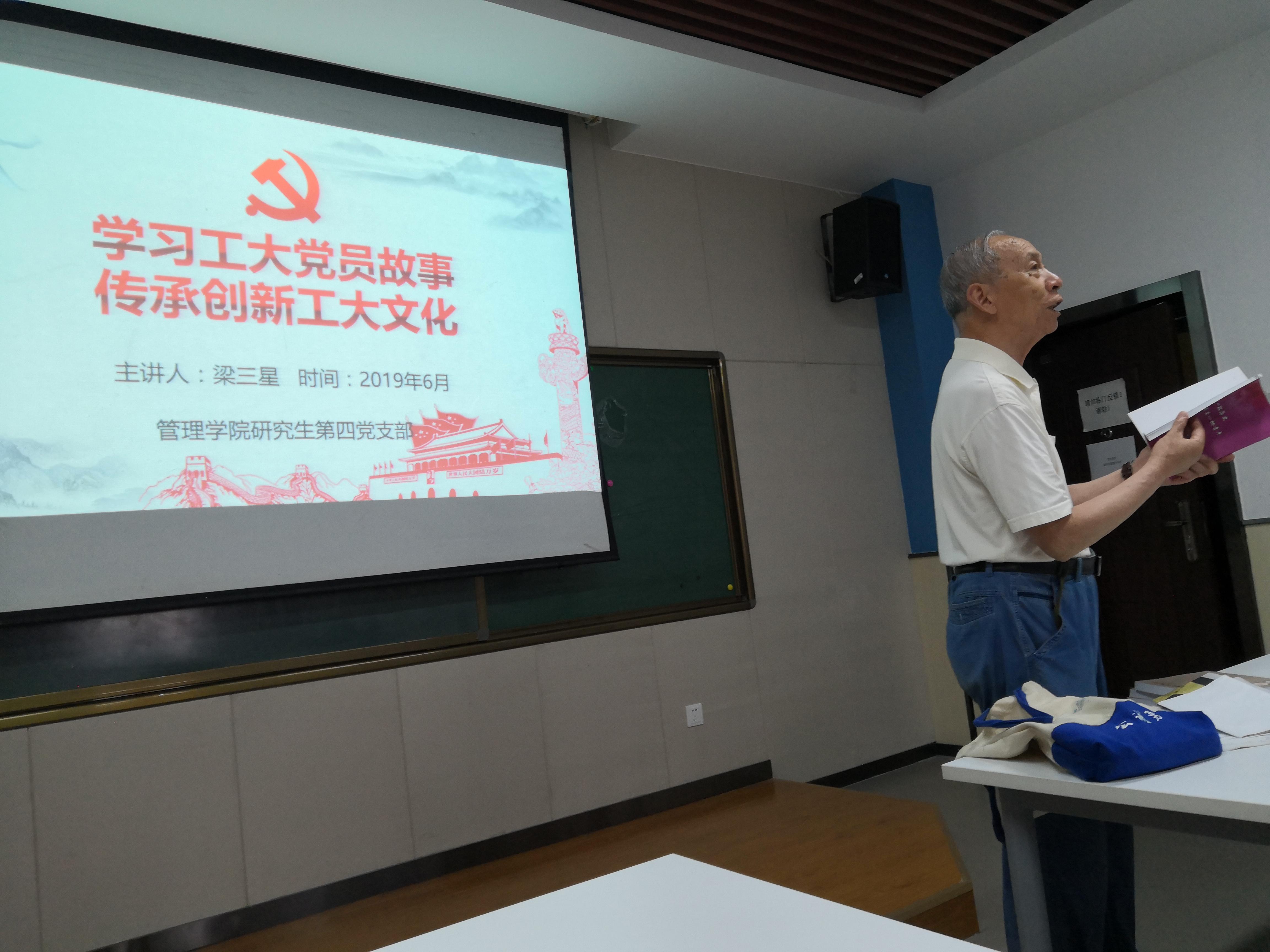 2019年6月12日(周三)下午,管理学院研究生教学督导、中共党员梁三星老师应邀在管理学院210报告厅做了主题为“学习工大党员故事,传承创新工大文化”的人文素养报告。报告会由管理学院研究生何拯主持,来自管理学院以及马克思主义学院的博、硕士研究生参加了此次报告会。