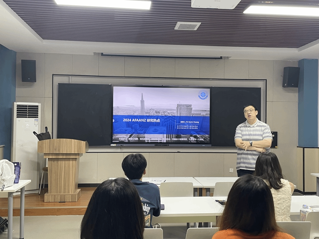 会上,黄泰然首先从AFAANZ (Accounting and Finance Association of Australia and New Zealand) 会议的背景展开介绍,和参会师生分享了2024 AFAANZ的两个主题演讲,以此来呼吁大家将会计研究的重心放到会计准则及其在实务中的应用。