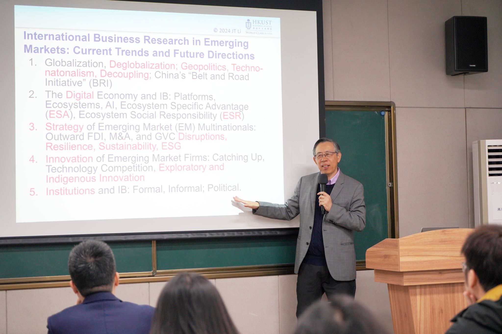 在此次报告中,李家涛深入阐述了新兴市场国际商务领域研究的当前趋势和未来方向;详细介绍了在国际顶级管理学期刊Journal of International Business Studies的五个特刊;强调了开展跨国公司韧性和可持续发展研究、海外投资研究及家族企业出海研究的重要性。在专题汇报中,李家涛表示,近年来,跨国公司在其经营的国家表现出不同的环境、社会和治理绩效。当跨国企业在监管更严格、规范压力更大的地区,其环境和治理绩效更好。在此背景下,研究聚焦跨国企业环境绩效,结果表明与东道国相比,跨国公司更有可能在母国实现碳减排,而跨国企业的长远导向和环境治理机制会有效缓解在母国和东道国的碳减排差距。