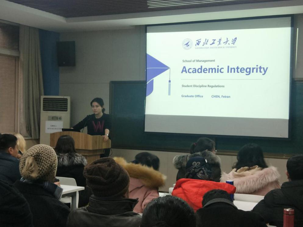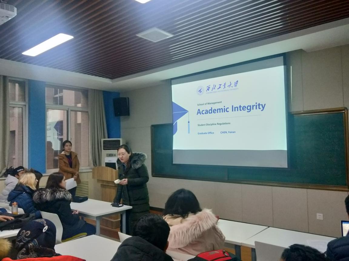 2018年12月27日下午4点,在管理学院210报告厅举办了留学生学术纪律说明会,说明会面向全体留学生,主要内容包括向硕博留学生同学们介绍毕业论文审核要求及注意事项,以及学院的考勤制度。参加说明会的老师有副院长贾明、英文留学生班主任邵婧、研究生教学秘书陈斐然和国际教育学院留学生辅导员姬老师、韩老师。说明会由外事秘书王霄主持。