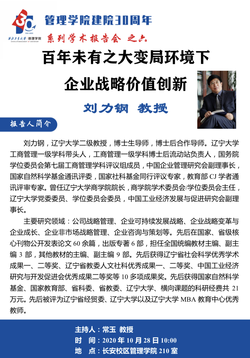 【管理学院建院30周年系列学术报告会之六】百年未有之大变局环境下企业战略价值创新