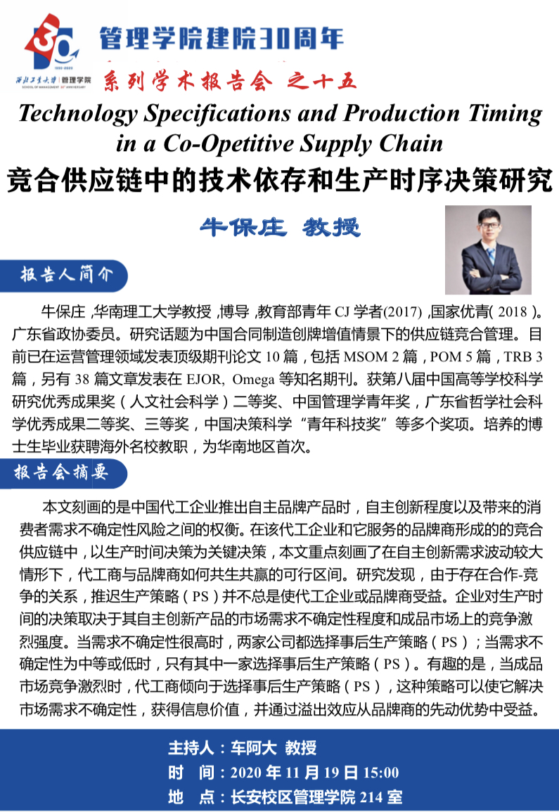 【管理学院建院30周年系列学术报告会之十五】竞合供应链中的技术依存和生产时序决策研究