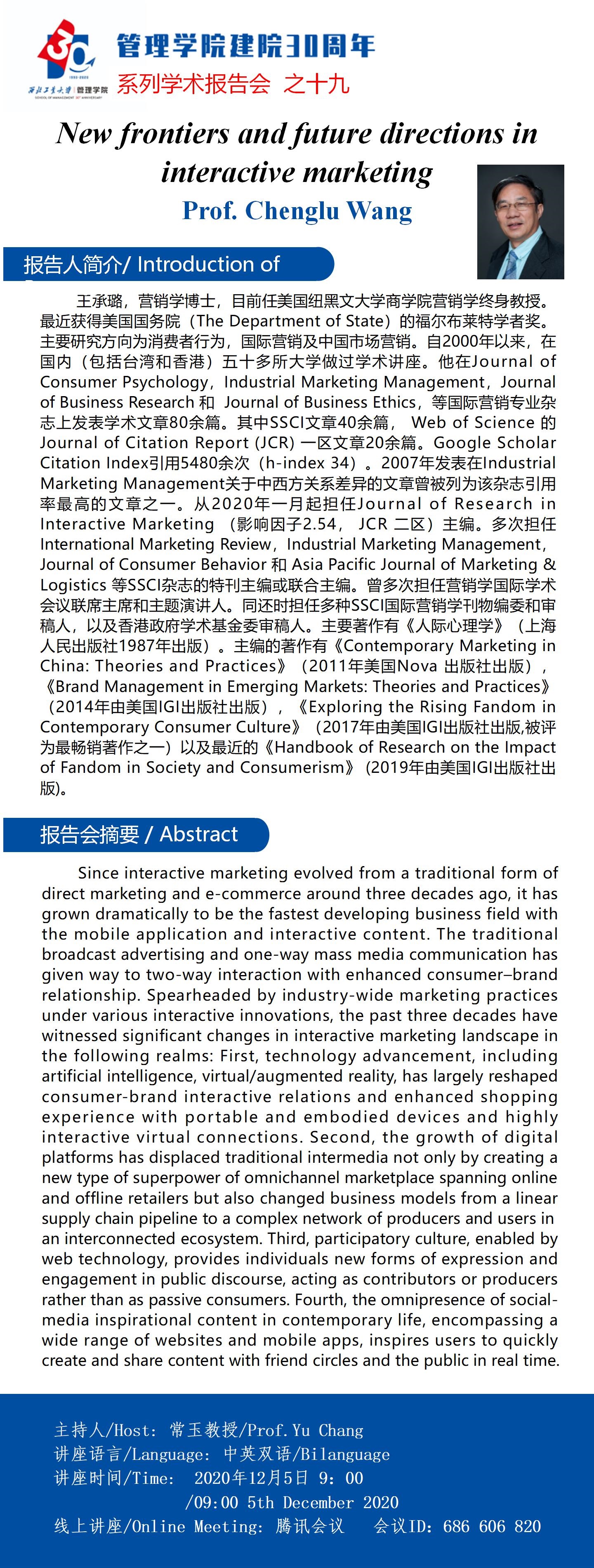 【管理学院建院30周年系列学术报告会之十九】New frontiers and future directions in interactive marketing