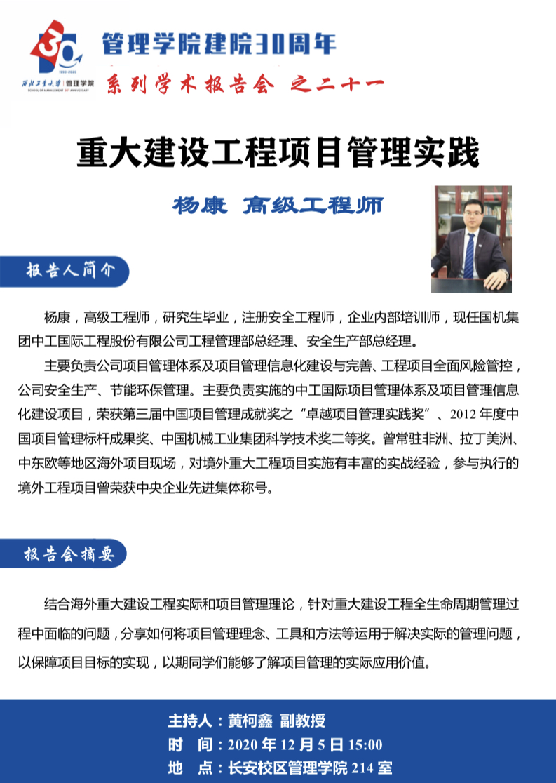 【管理学院建院30周年系列学术报告会之二十一】重大建设工程项目管理实践
