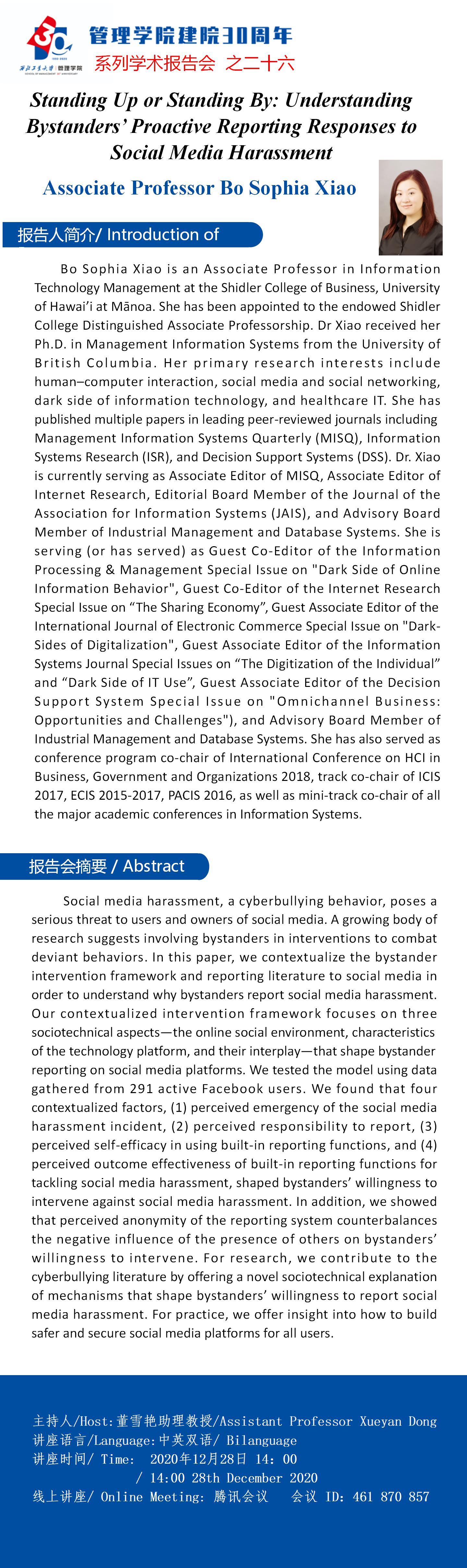 【管理学院建院30周年系列学术报告会之二十六】Standing Up or Standing By: Understanding Bystanders’ Proactive Reporting Responses to Social Media Harassment
