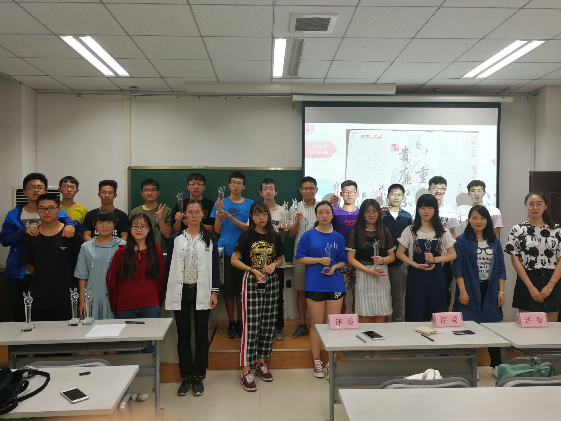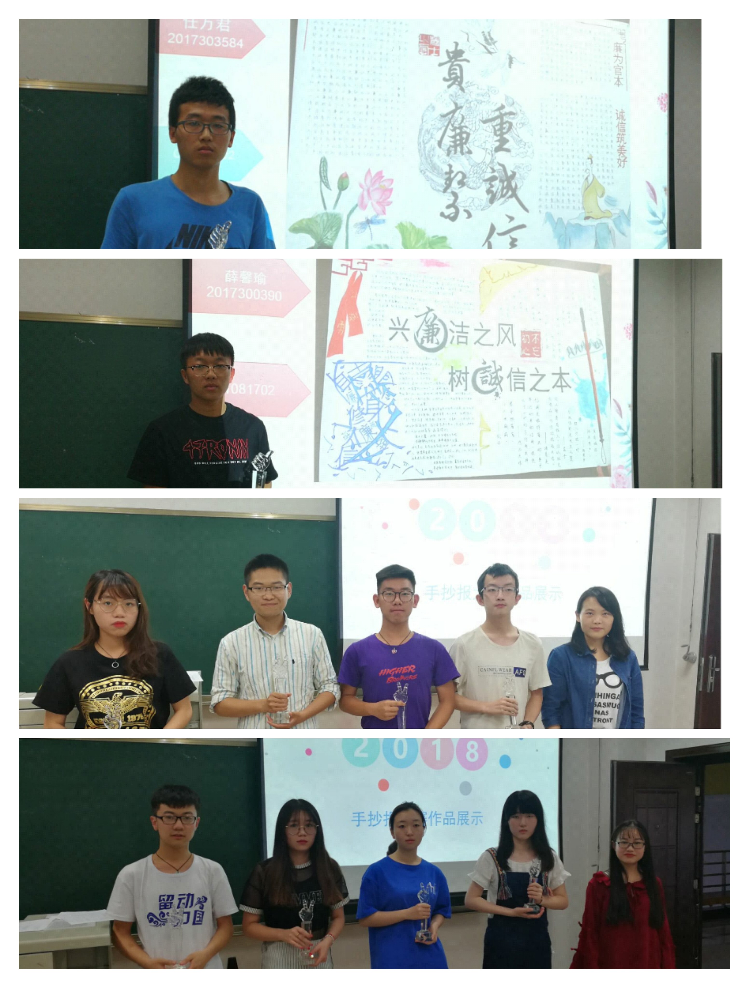 比赛总有输赢之分,在听完选手们的精彩讲解后,工作人员秉着公正的原则对评委评分表以及选手互评打分表的分数进行了统计,最终评选出了两张一等奖作品,四张二等奖作品,四张三等奖作品以及三张特色奖作品。分别由四位评委为选手们颁奖,最后选手与工作人员及评委合影留念。