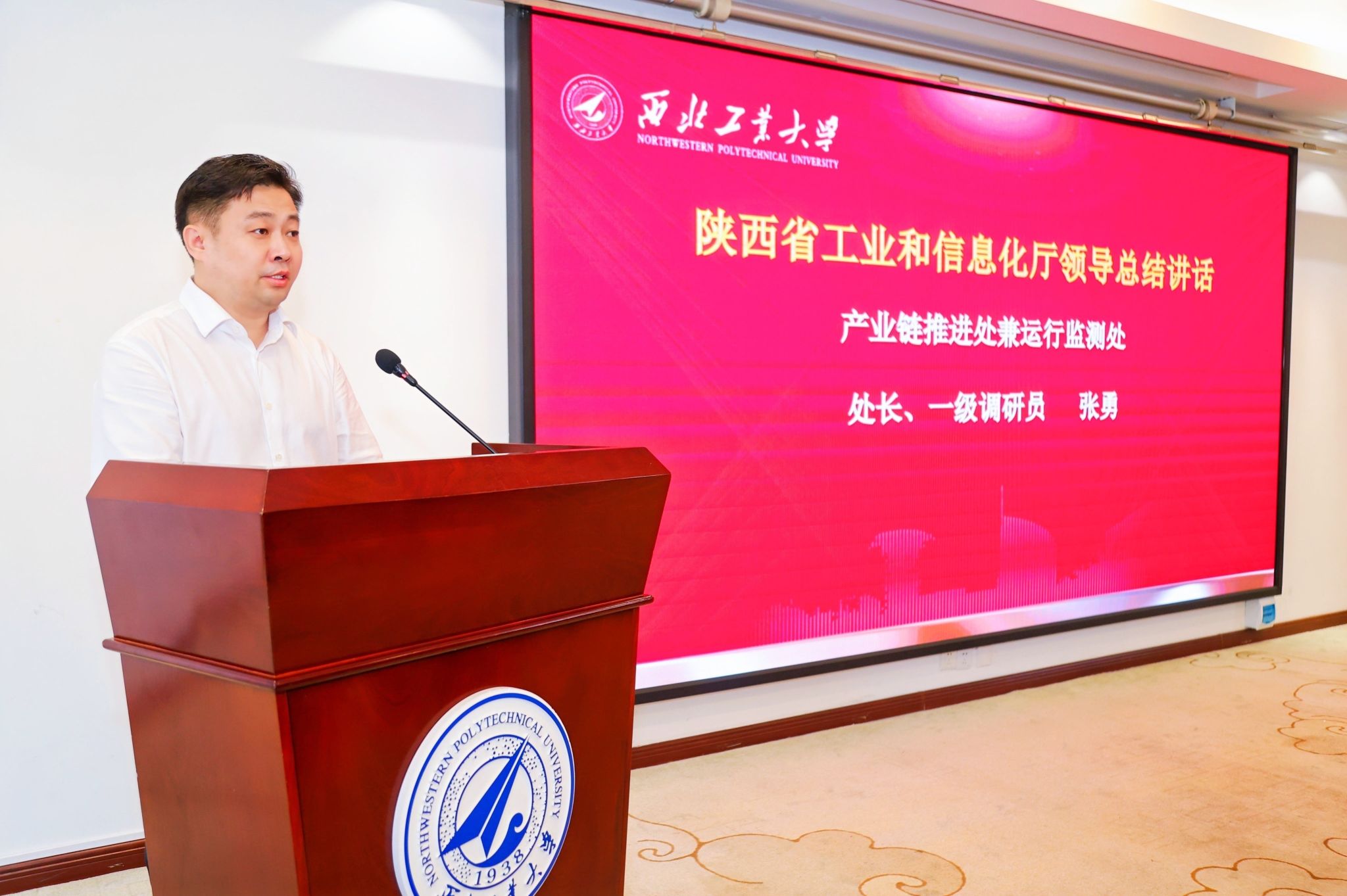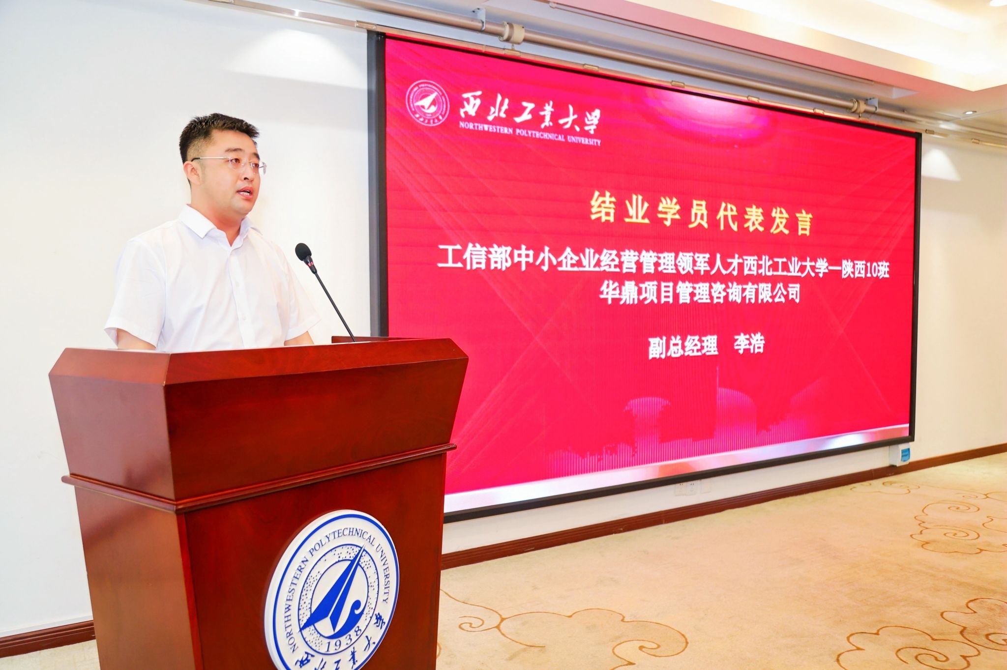 张勇处长总结讲话,代表陕西省工信厅向为培训班成功举办倾注了大量心血与汗水的西工大管理学院表示衷心的感谢,向全体学员的顺利结业表示热烈的祝贺。他说到:“国家高度关注和重视民营经济中小企业发展,心系产业链供应链安全稳定。陕西省委、省政府始终把发展制造业和支持民营经济中小企业摆在突出位置,省工信厅非常重视中小企业企业家队伍建,希望各位学员真正把学习的成果转化为促进企业发展的强大动力,一是要把本次培训结业当做新的起点;二是传承“永不毕业”传统;三是提高政治站位,树立家国情怀,共同成为新时期秦商精神的实践者与见证者。也希望西工大发挥高校教育资源丰富优势,继续发挥综合枢纽作用,打造出更多精品课程,助力我省中小企业高质量发展。”