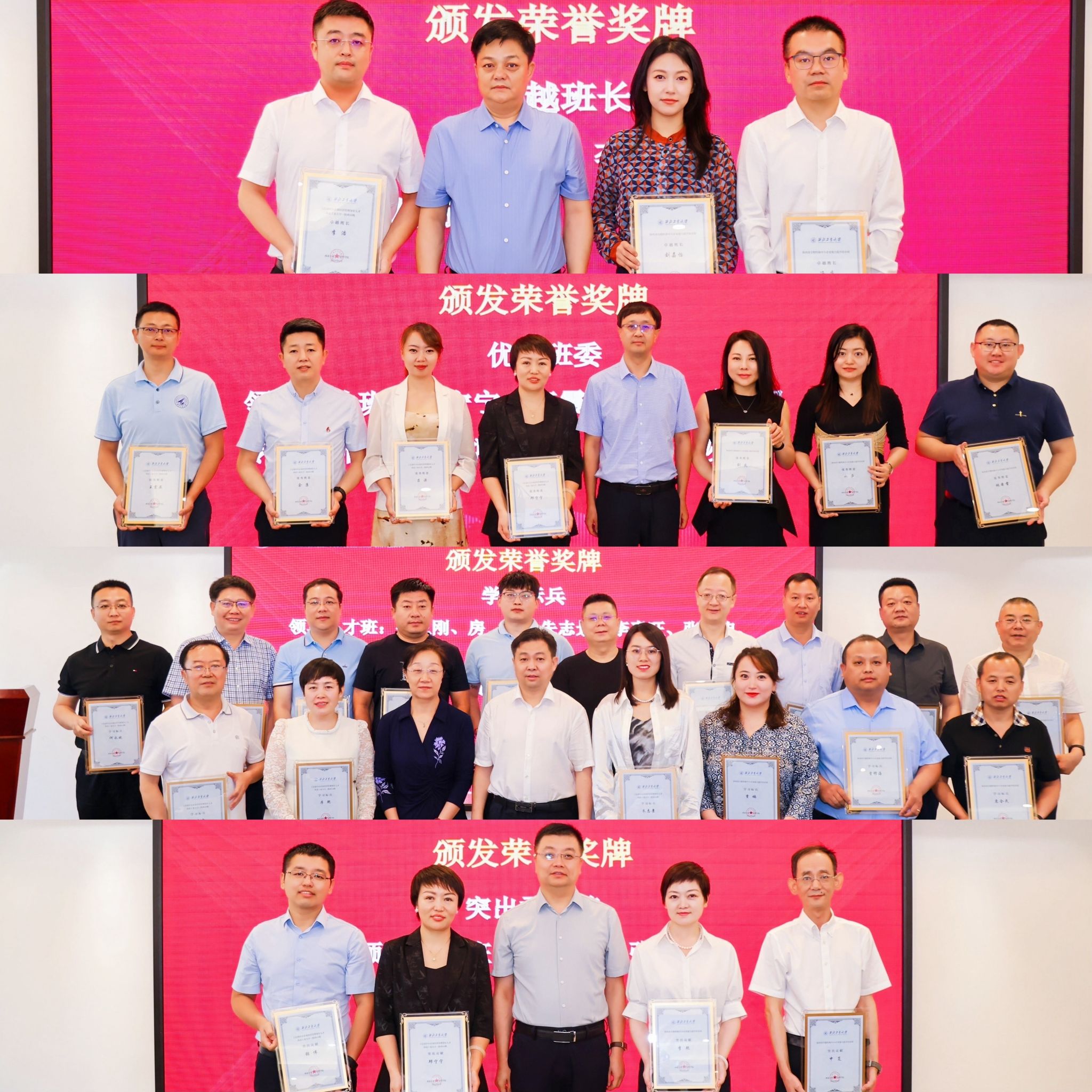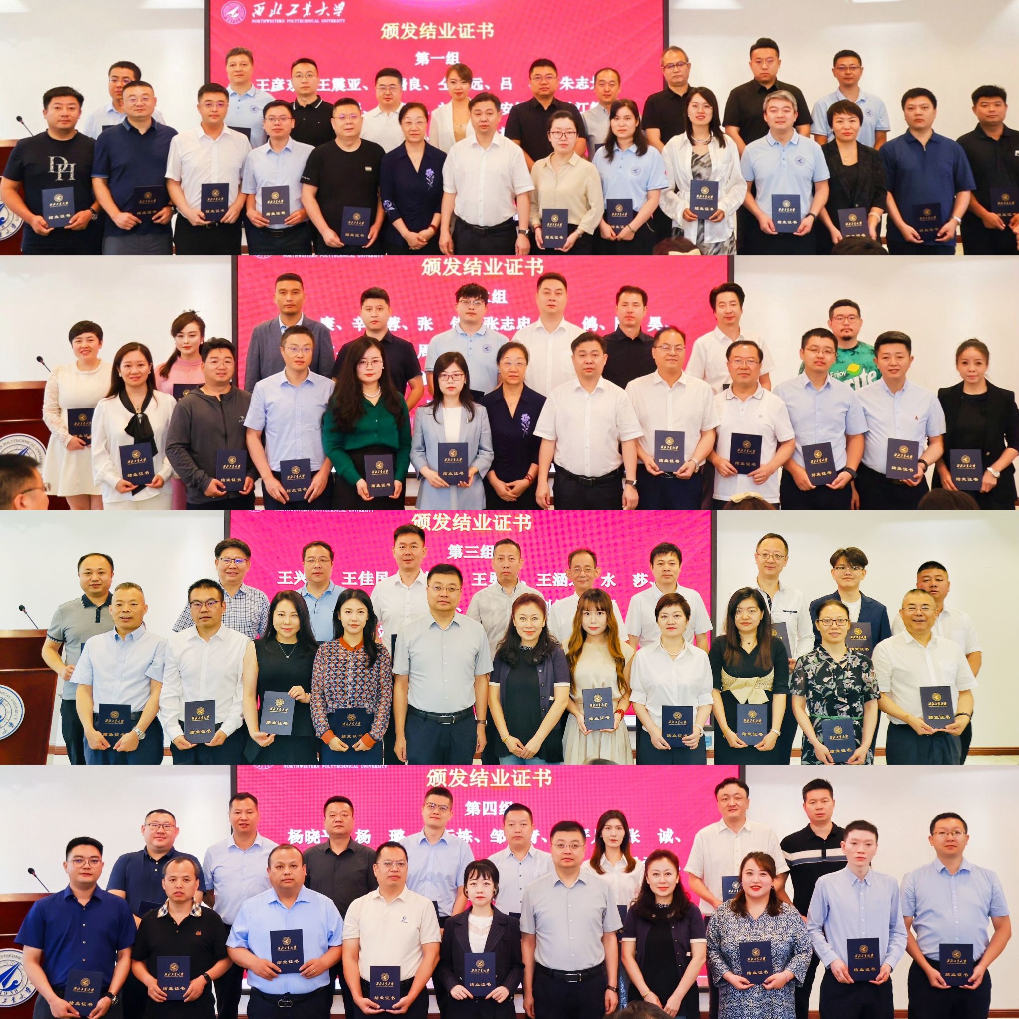 在两个班结业回顾短片后,省工信厅产业链推进处兼运行监测处张勇处长、中小企业服务处豆宁处长,非公经济发展处黄克强二级调研员,中小企业人才服务中心李卫科副主任,西工大管理学院张爽书记,对外联络办公室徐伟侠副主任为结业学员颁发结业证书和荣誉奖牌。希望结业学员们发挥传帮带作用,继续为西工大企业家培育平台建设添砖加瓦。
