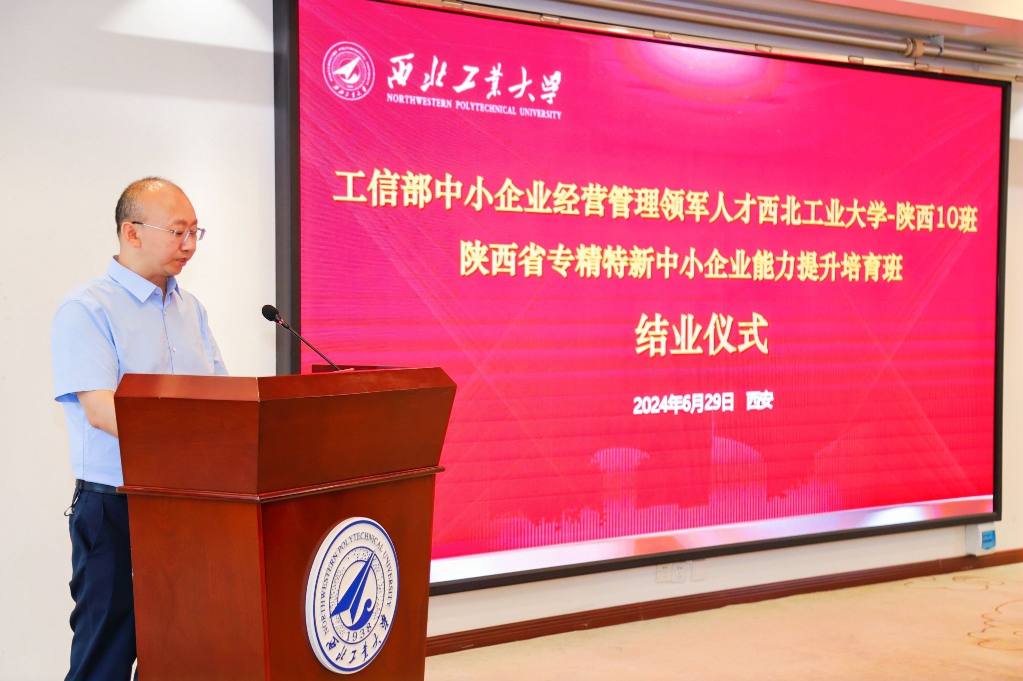 6月29日上午,工信部中小企业经营管理领军人才西北工业大学—陕西10班、陕西省专精特新中小企业能力提升培育班结业仪式在西北工业大学友谊校区顺利举行。陕西省工业和信息化厅产业链推进处兼运行监测处处长、一级调研员张勇,中小企业服务处处长豆宁,非公经济发展处二级调研员黄克强,中小企业人才服务中心副主任李卫科,西北工业大学管理学院党委书记张爽,管理学院副院长郭云涛,对外联络办公室副主任、教育基金会副秘书长徐伟侠,领军人才企业家校友会秘书长吴宏璞,领军人才西工大-陕西9班班长李佳、11班书记张爱军、11班副班长王虎刚、12班班长邓维清以及工信部中小企业经营管理领军人才西北工业大学—陕西10班、陕西省专精特新中小企业能力提升培育班学员90余人参加了结业仪式,仪式由西北工业大学管理学院副院长郭云涛主持。