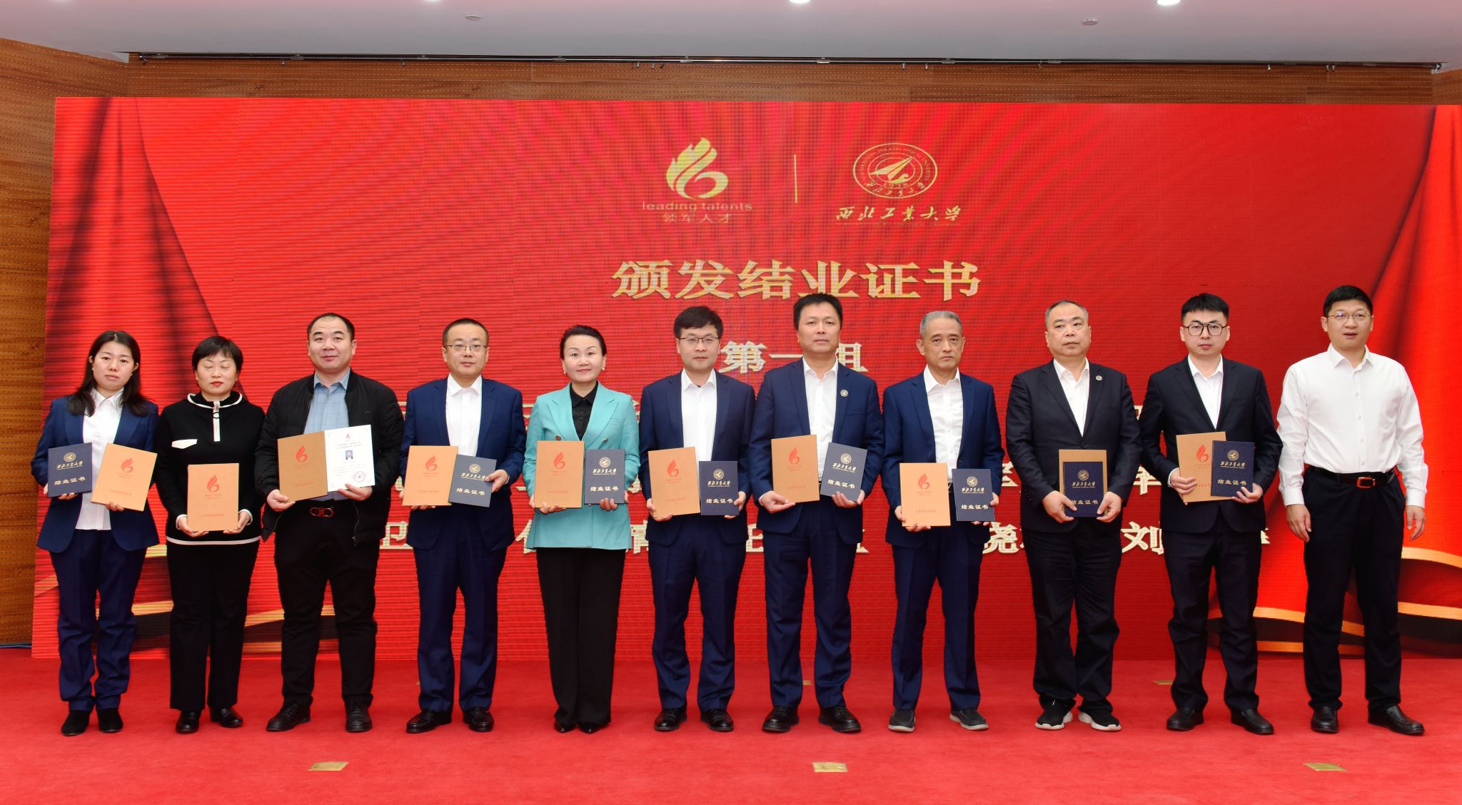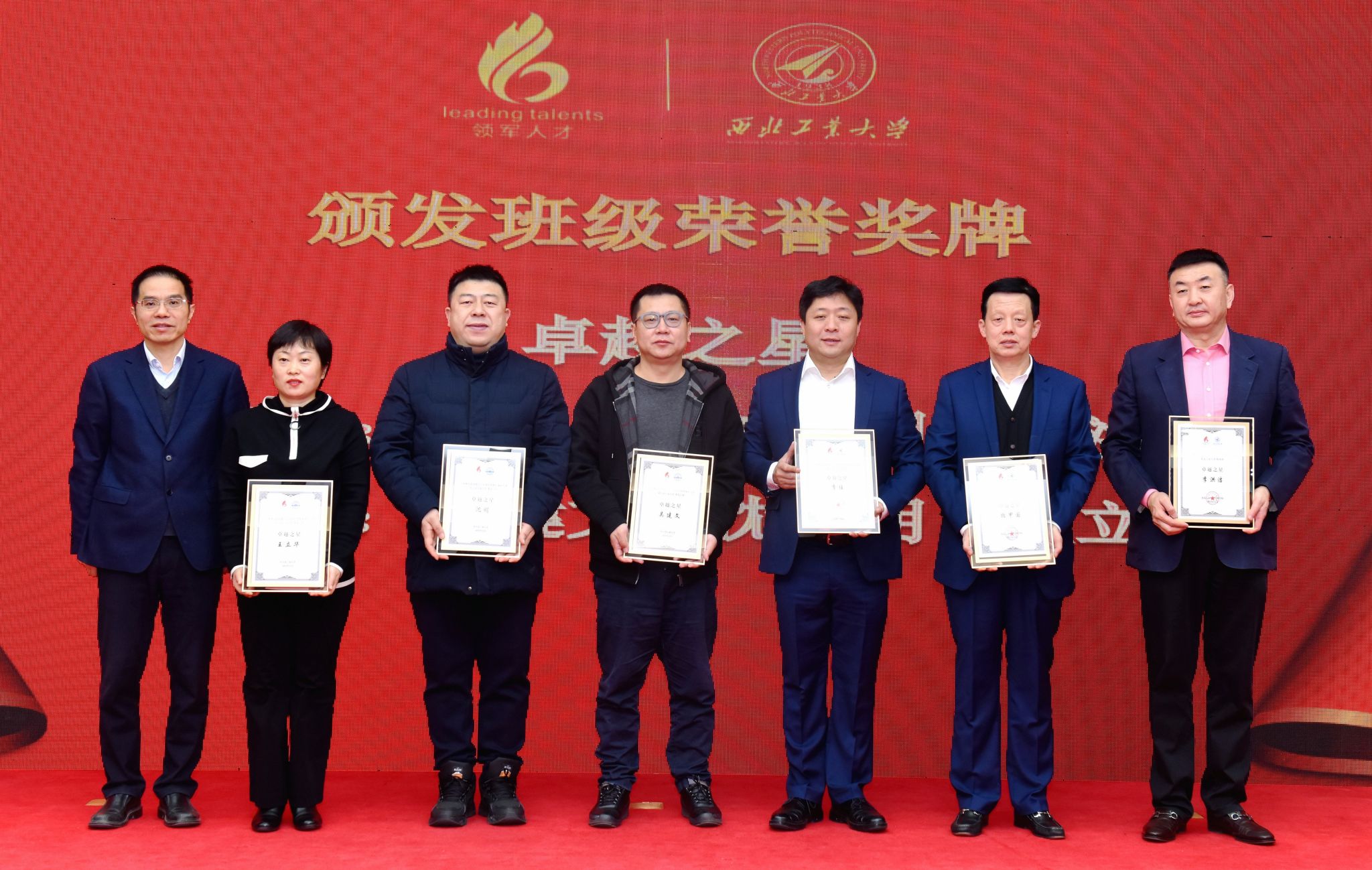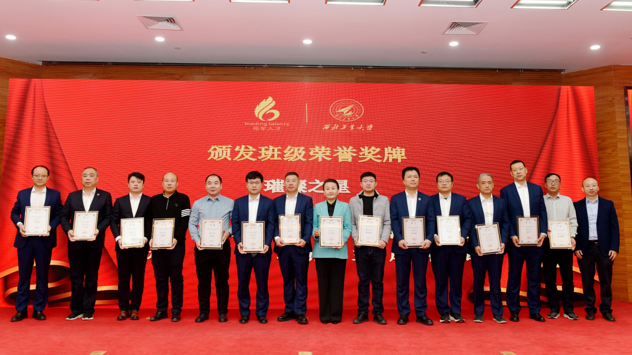 在一段结业回顾短片后,工业和信息化部人才交流中心服务处白晓处长、服务处中小企业部陆书涛主任,西北工业大学校友会杨铭秘书长、管理学院车阿大院长、郭云涛副院长,哈尔滨工业大学经济与管理学院领军人才办公室王晶辉主任为结业学员颁发结业证书和表彰奖牌,为新学员代表授班旗、佩戴领军徽章和西北工业大学校徽,西工大领军班、哈工大领军班互动留念,传承“聚是一团火,散是满天星,领军一家亲,全国有亲人”的领军精神和文化。