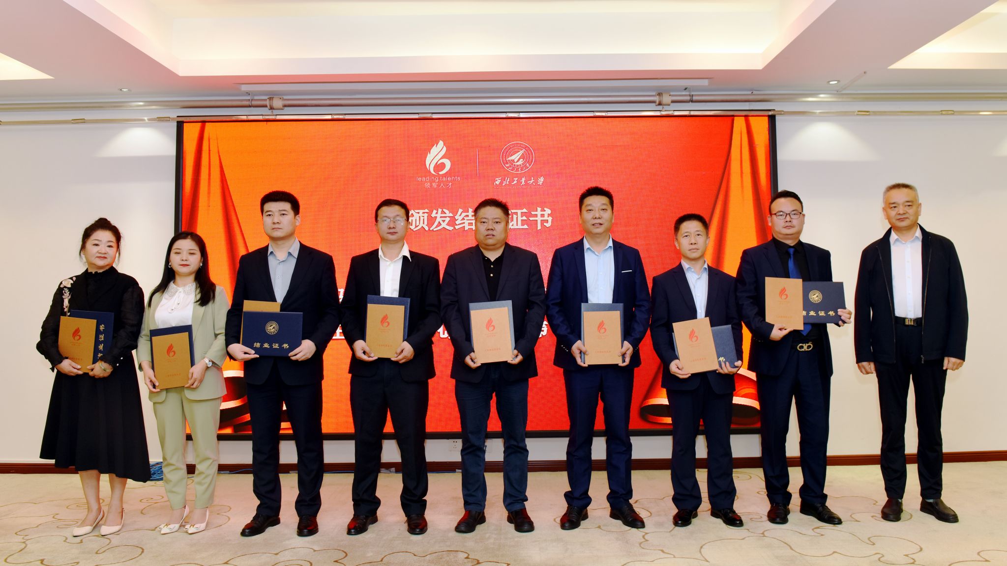 结业学员代表和新学员代表先后发言后,工业和信息化部人才交流中心服务处白晓处长、陕西省工业和信息化厅非公经济发展处张进处长、西北工业大学管理学院车阿大院长、乔彩燕书记等为结业学员颁发结业证书和表彰奖牌,为新学员代表授班旗、佩戴领军徽章和西北工业大学校徽,传承“聚是一团火,散是满天星,领军一家亲,全国有亲人”的领军精神和文化。