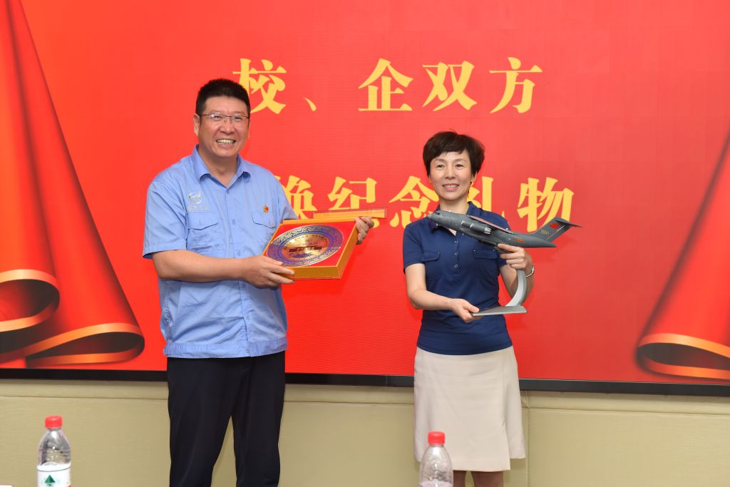 西北工业大学管理学院党委书记乔彩燕,航空工业西安航空制动科技有限公司党委书记、董事长付鹏锋作为校企双方代表互换纪念礼物,期待航空制动与管理学院后期在充分发挥双方优势资源的协同效应下,同舟共济,协力发展,共同为祖国航空事业腾飞竭力奉献。