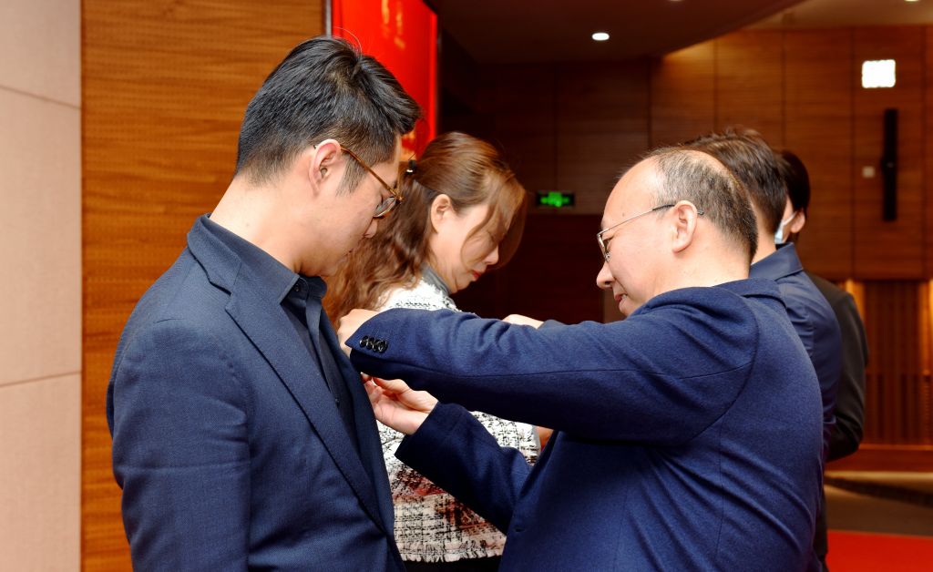 陕西省工信厅中小企业服务处张勇处长、西北工业大学管理学院郭云涛副院长为新学员代表佩戴领军徽章和西北工业大学校徽。