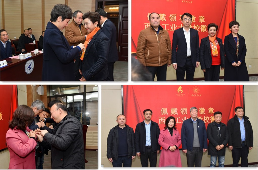 陕西省工业和信息化厅非公经济处二级调研员王建峰、西北工业大学管理学院党委书记乔彩燕、陕西省工业和信息化厅非公经济发展处四级调研员钱土根、陕西省中小企业人才服务中心副主任李卫科、西北工业大学管理学院副院长郭云涛为领军人才学员佩戴“领军人才”徽章和西北工业大学校徽。