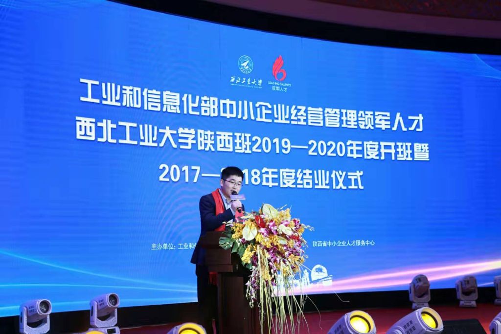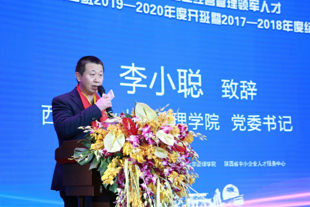 开班、结业仪式在领军人才的官宣片和西北工业大学庄严校歌中拉开序幕。西北工业大学管理学院李小聪书记致辞,热烈欢迎2019-2020年度新学员入学,祝贺2017-2018年度老学员顺利完成学业。中央对中小企业的培训足够重视,西工大作为“工信部中小企业经营管理领军人才培训”在西北地区的唯一获授权机构,从2013年开始和陕西省工信厅紧密合作开办了8期,结业了近500名企业家,在7年的培训办学过程中积累了丰富的经验,形成了西工大教育特色。李书记介绍了西北工业大学背景、管理学院学科发展、国际合作的概况,指出:“这都是领军人才培训的重要资源,希望领军人才大平台能成为管理学院一个新平台,成为管理研究、人才培养和高校成果转化的平台。此外,西工大领军人才校友会经过了半年多的筹备于今晚进行成立仪式,将成为学员交流感情、持续学习、共商发展的平台,希望能得到校友们的积极支持。”