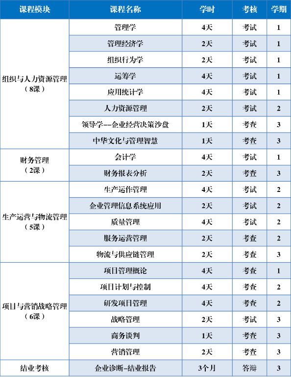 培训周期计划安排3学期,共1.5年,其中3学期完成课程学习,3个月进行结业报告撰写与评审,采用周末集中授课模式。