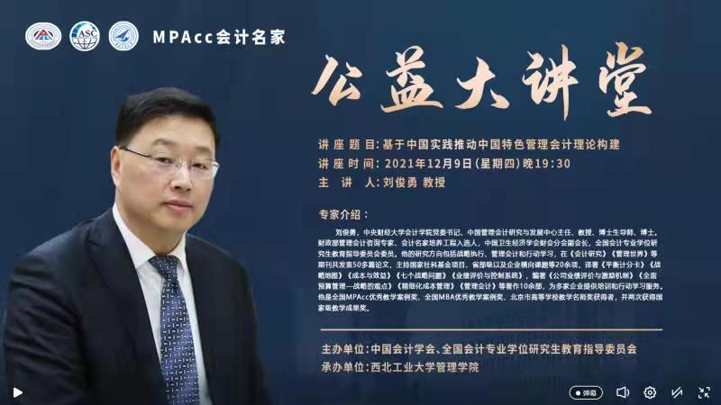 12月9日晚,由中国会计学会、全国会计专业学位研究生教育指导委员会主办,管理学院承办的“MPAcc会计名家公益大讲堂”通过线上直播方式顺利举行。本次讲座特邀全国会计专业学位研究生教育指导委员会委员、MPAcc会计名家、中央财经大学会计学院博士生导师刘俊勇教授主讲。讲座由管理学院MPAcc教育中心金帆主任主持,管理学院及全国各兄弟院校共计1600余名师生在线聆听了本次讲座。
