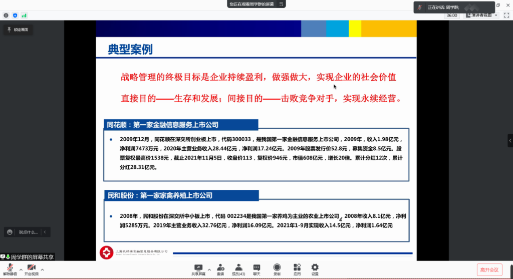 周先生通过典型案例分享,介绍了我国多层次的资本市场的特点、上市条件、上市路径,以及如何利用资本市场解决企业发展中不同阶段的深层次问题,分析了利用资本市场推动公司发展、实现企业战略的成功案例。尤其在企业如何利用资本市场进行战略布局,做大做强方面,让同学们有了许多深刻的思考和认识。