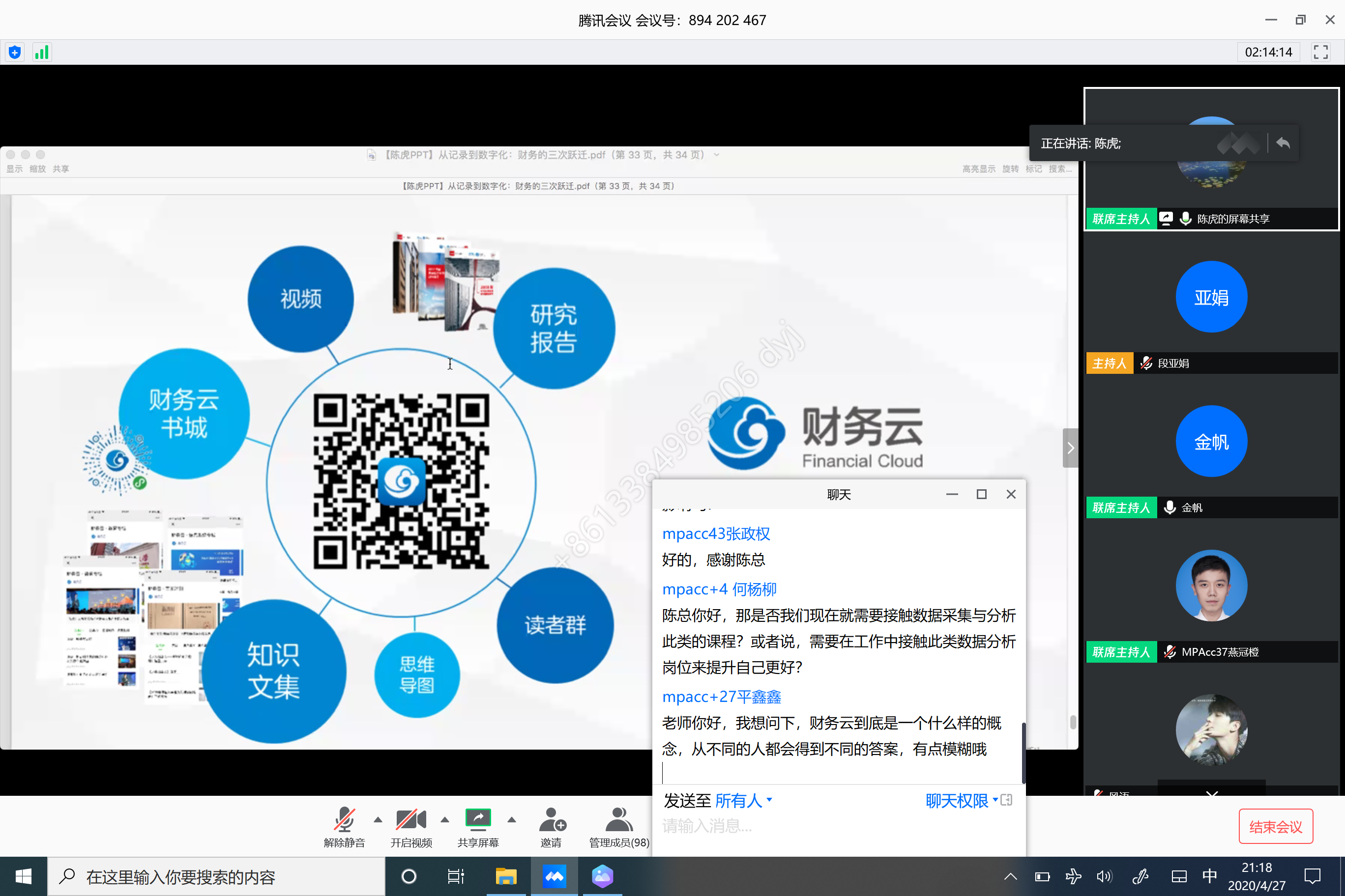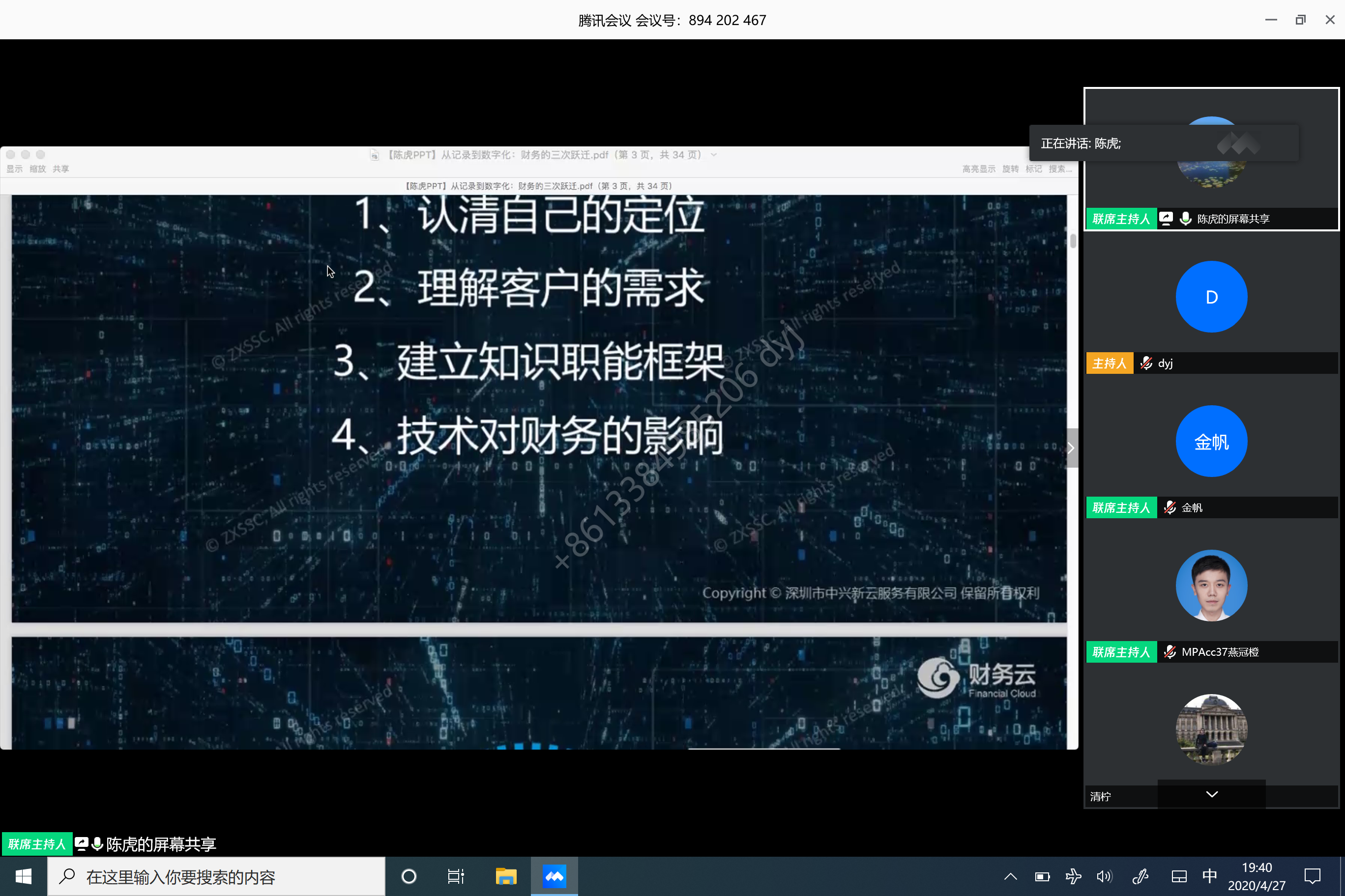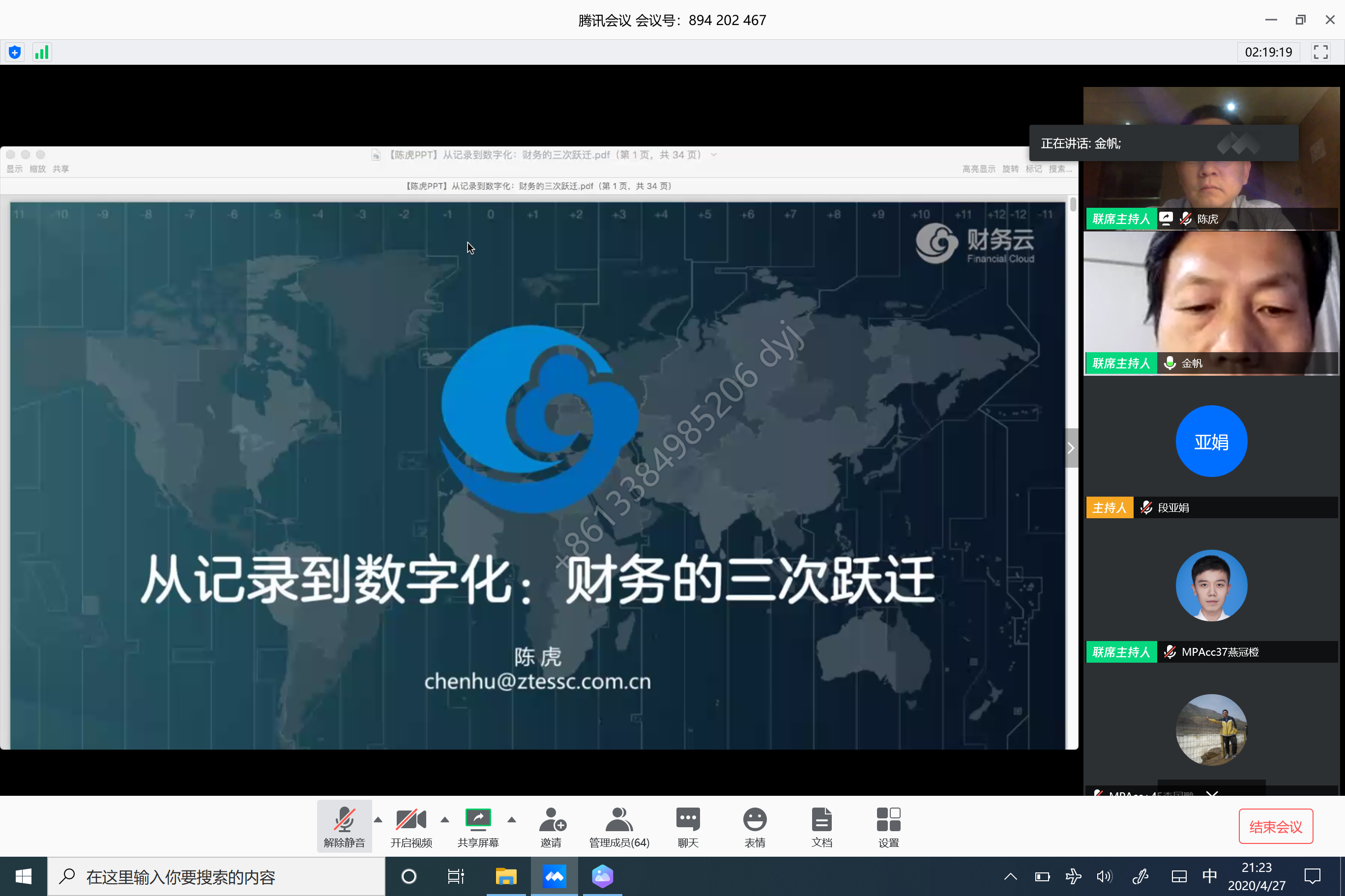 4月27日晚,我院特邀中兴新云服务有限公司总裁陈虎先生采用腾讯会议平台为学院师生做了题为“从记录到数字化:财务的三次跃迁”的讲座。本次讲座由MPAcc教育中心主任金帆副教授主持,共有MPAcc、EMBA、MBA等一百多名专业学位研究生和学院部分教师进行了在线聆听。