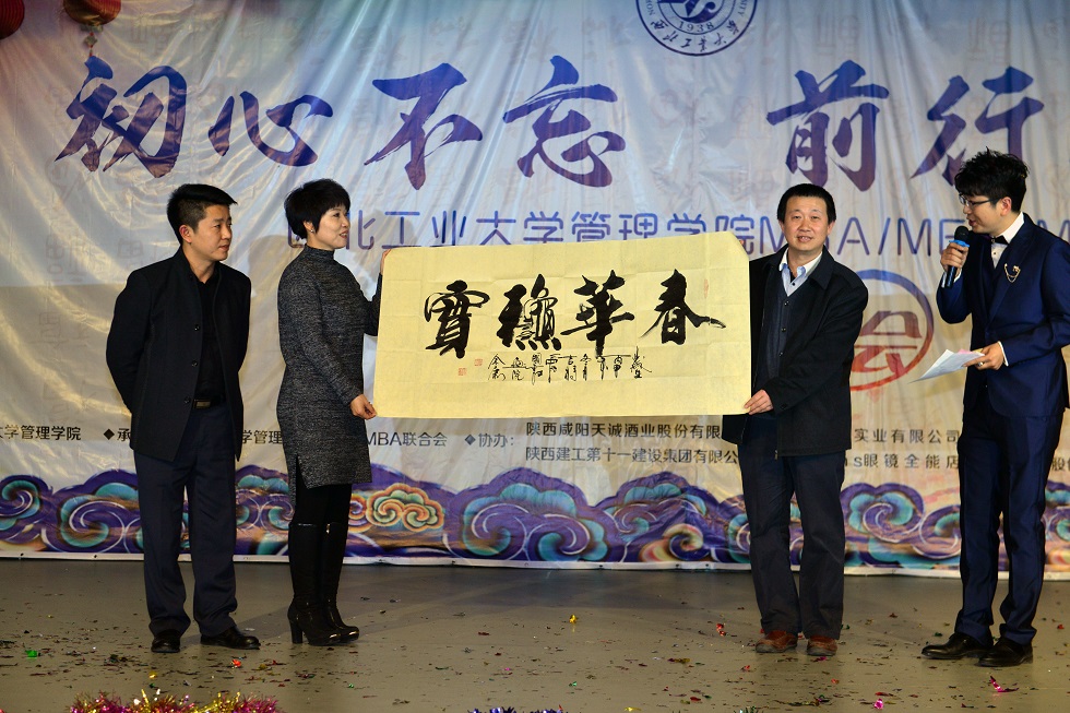 红日升空辉大道,金鸡报晓促长征。1月1日晚,西北工业大学管理学院在友谊校区成功举办 “初心不忘,前行共赢”2017 专业学位新年晚会。管理学院院长车阿大、党委书记李小聪、副院长王克勤、副院长刘晨光、副书记张翠仙、校友会综合科科长刘江、专业学位招生办公室主任郭德、EMBA教育中心副主任肖平、办公室副主任翟润及管理学院的导师代表们莅临晚会现场。管理学院历届优秀校友,2015级返校开题的所有同学及2016级西安班、咸阳班的MBA/MEM/ME学员共300余人参加并观看了晚会。晚会得到了陕西天成酒业、陕建集团、香港洛施实业、A-Lens美瞳眼镜全能店和上海融发贵金属等单位的赞助支持。