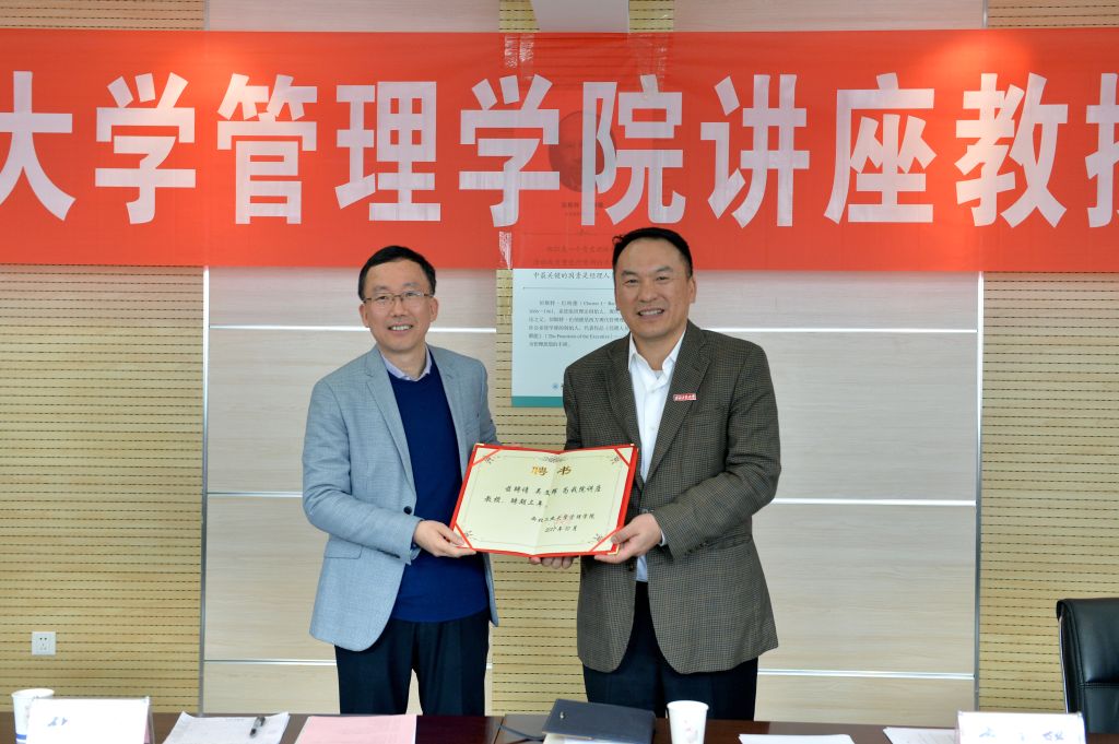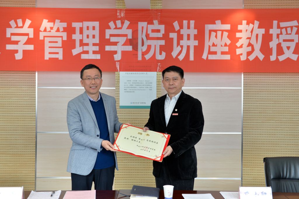 李小聪致欢迎词并介绍了到场的诸位来宾。他表示,根据管理学院学科特点,在人才培养、科学研究和社会服务中,需要构建多元化师资队伍,聘请既有管理理论又有长期管理实践的专家,参与学院的建设发展,尤其是诸如大学生创新创业、MBA、EMBA等专业学位教育,青年教师培养等方面,深感需要企业界专家的参与。形成校内教师与企业家讲座教授交流互动、发挥各自优势共同开展人才培养、科学研究及社会服务的师资队伍格局,并深化与企事业单位的交流合作,促进理论研究与管理实践相结合,是学院推进“双一流”建设发展的有效途径。管理学院从2017年初开始,在校友企业家及各行业知名管理专家中开展讲座教授遴选工作。本次聘任的企业家讲座教授经过了学院学术委员会和党政联席会的研究,得到了受聘企业家的支持。