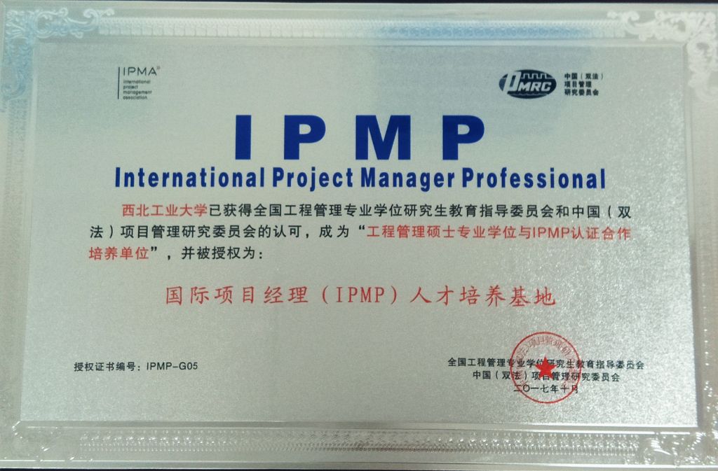 10月31日,全国工程管理专业学位研究生教育指导委员会发布《关于第一批工程管理硕士与国际项目管理专业资质认证合作单位评审结果的通知》,全国工程管理专业学位研究生教育指导委员会与中国(双法)项目管理研究委员会(PMRC)暨国际项目管理专业资质认证(IPMP)中国认证委员会专家评审组评审,确定西北工业大学成为首批获准开展IPMP认证合作资格的25所培养单位之一,成为“国际项目经理(IPMP)人才培养”基地。