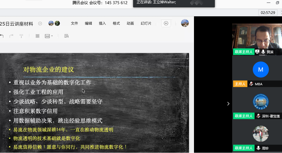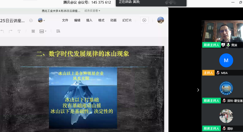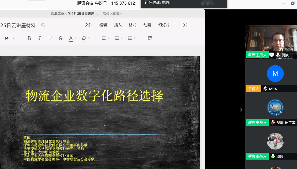 4月25日上午,我院企业导师黄滨教授应邀在腾讯会议平台为专业学位研究生做《新冠肺炎疫情后物流企业数字化路径选择》的讲座。会议由周珍老师主持,约200名学生在线聆听了讲座。