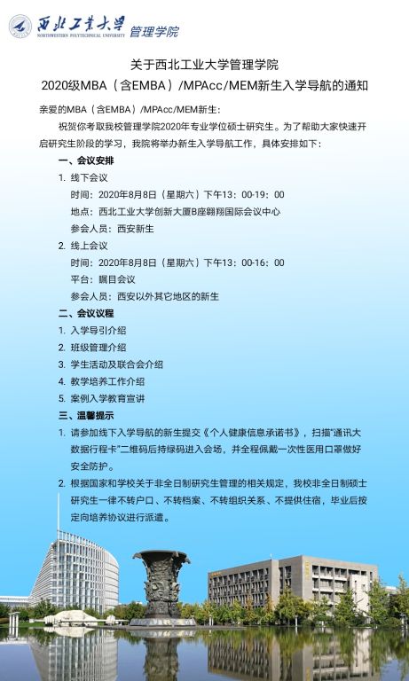 关于西北工业大学管理学院 2020级MBA(含EMBA)/MPAcc/MEM新生入学导航的通知