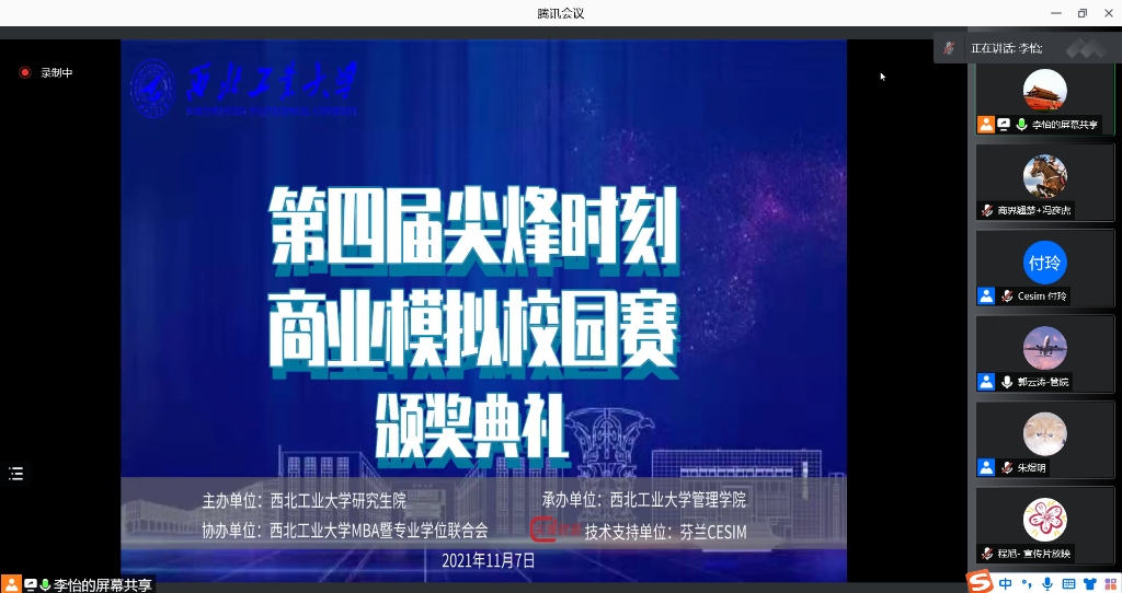 11月7日上午,第四届西北工业大学“尖烽时刻”商业模拟校园赛颁奖典礼在线上顺利举行。研究生院副院长汪焰恩,管理学院副院长郭云涛,管理学院教授朱煜明, Cesim中国西北服务中心负责人付玲和参赛选手参加了本次会议,会议由MBA/MEM教育中心学生工作主管李怡主持。