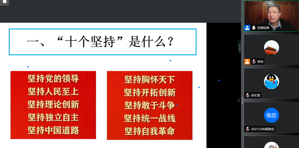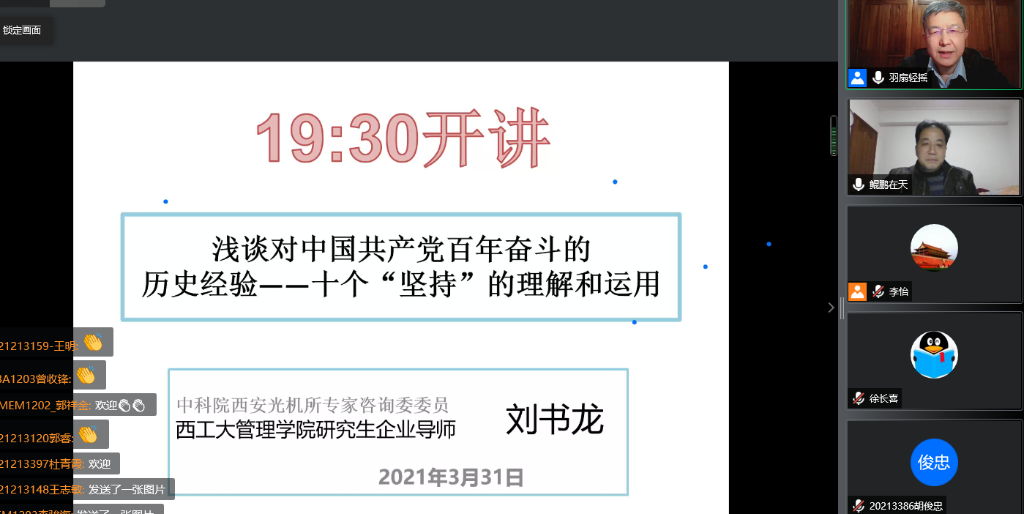3月31日晚,管理学院企业导师刘书龙为专业学位研究生作《浅谈对中国共产党百年奋斗的历史经验——十个“坚持”的理解和运用》云上讲座,线上近400名学生参加,讲座由管理学院郭鹏教授主持。
