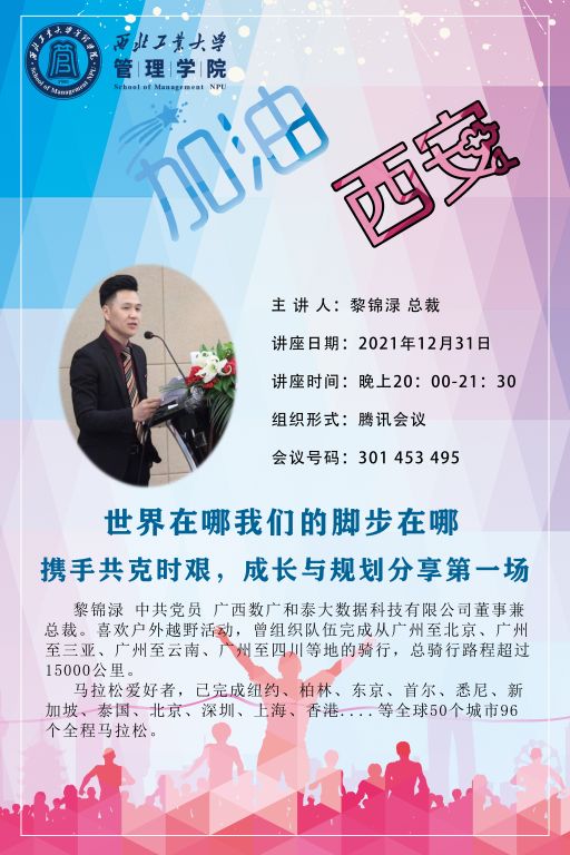 2021年12月31日晚,管理学院2020级MBA学生、广西数广和泰大数据科技有限公司董事兼总裁黎锦渌同学,带来了《世界在哪我们的脚步在哪》的分享。黎锦渌学长讲述了自己从2012年开始,总骑行路程超过15000公里,完成全球50个城市96个全程马拉松的历程;分享了与同学参加亚沙赛、秦岭越野跑等活动的经历,让同学们感受世界的广阔与美好,带领同学们认识到团队与自律带来的改变,鼓励同学们乐观面对人生路上的困难。