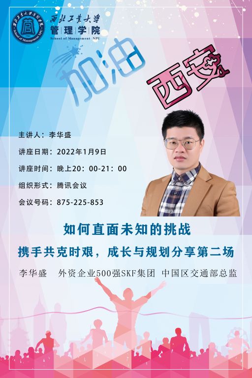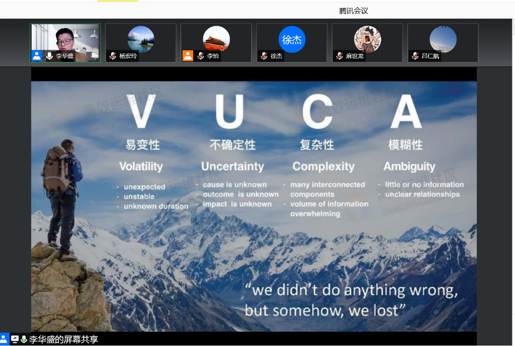 2022年1月9日晚,管理学院2020级MBA学生、500强企业SKF集团中国区交通部总监李华盛同学,带来了《如何直面未知的挑战》的分享。李华盛学长结合自己的亲身经历,向同学们讲述了如何在这个充满变化的VUCA时代做好迎接变化的准备,他从接受变化更新自己、识别变化、保持好奇心、面对失败、躬身自省等方面,给同学们给出了具体的建议。