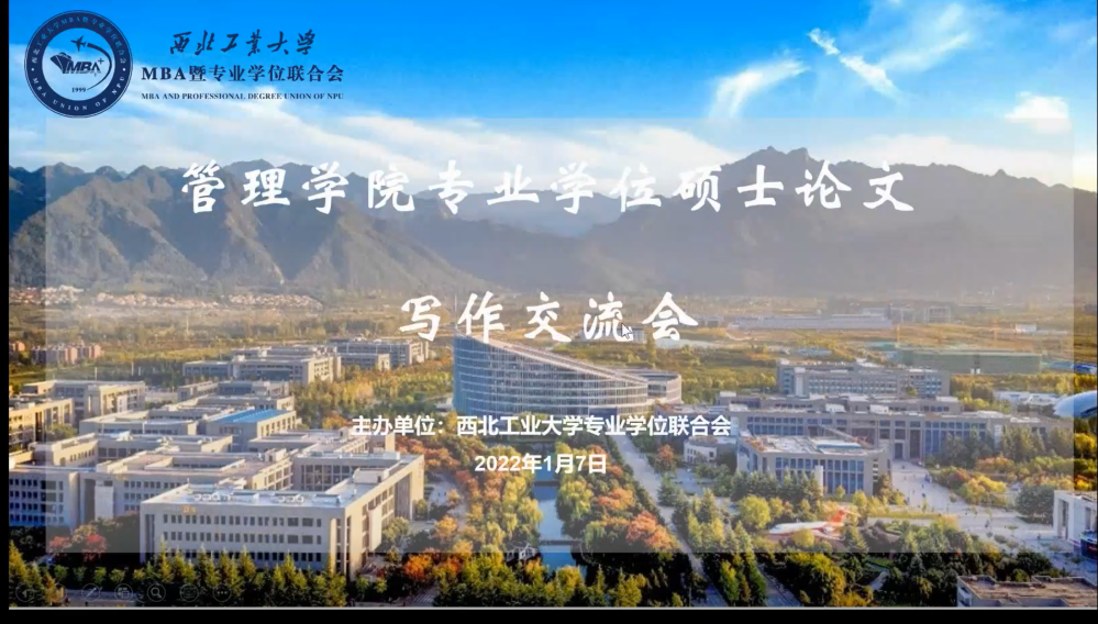 2022年1月7日晚,管理学院MBA暨专业学位联合会通过腾讯会议组织开展了《管理学院专业学位硕士论文写作交流会》,邀请2018级校友陈先竹和宋庭剑先生分享了他们论文撰写过程的经验和收获,2020级专业学位研究生170余人参会进行了交流。