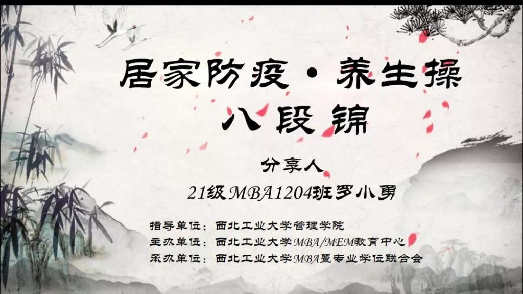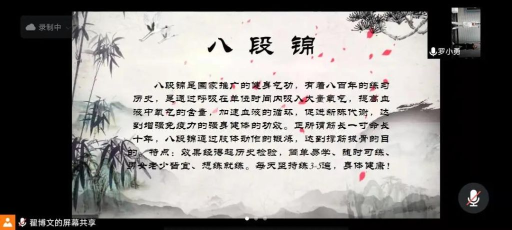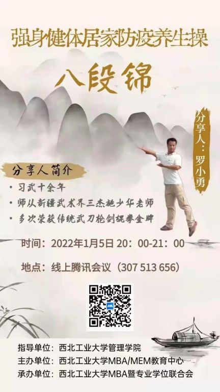 1月5日晚,MBA暨专业学位联合会通过腾讯会议组织开展《强身健体居家防疫养生操--八段锦》“云锻炼”分享会。此次分享会邀请到2021级MBA1204班罗小勇同学进行分享,为管理学院专业学位师生带来一场视觉盛宴,带领我们走进“八段锦”的养生世界。