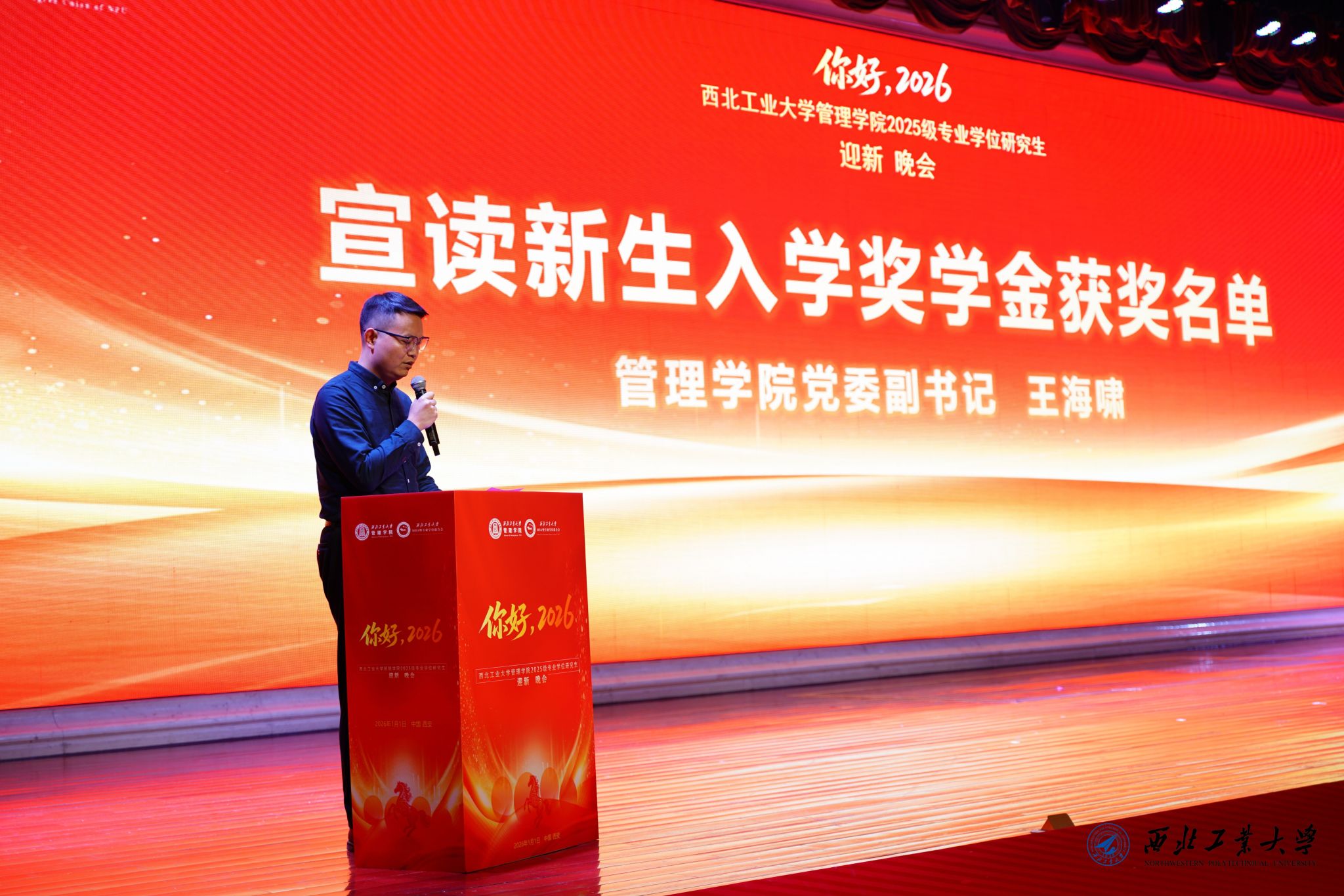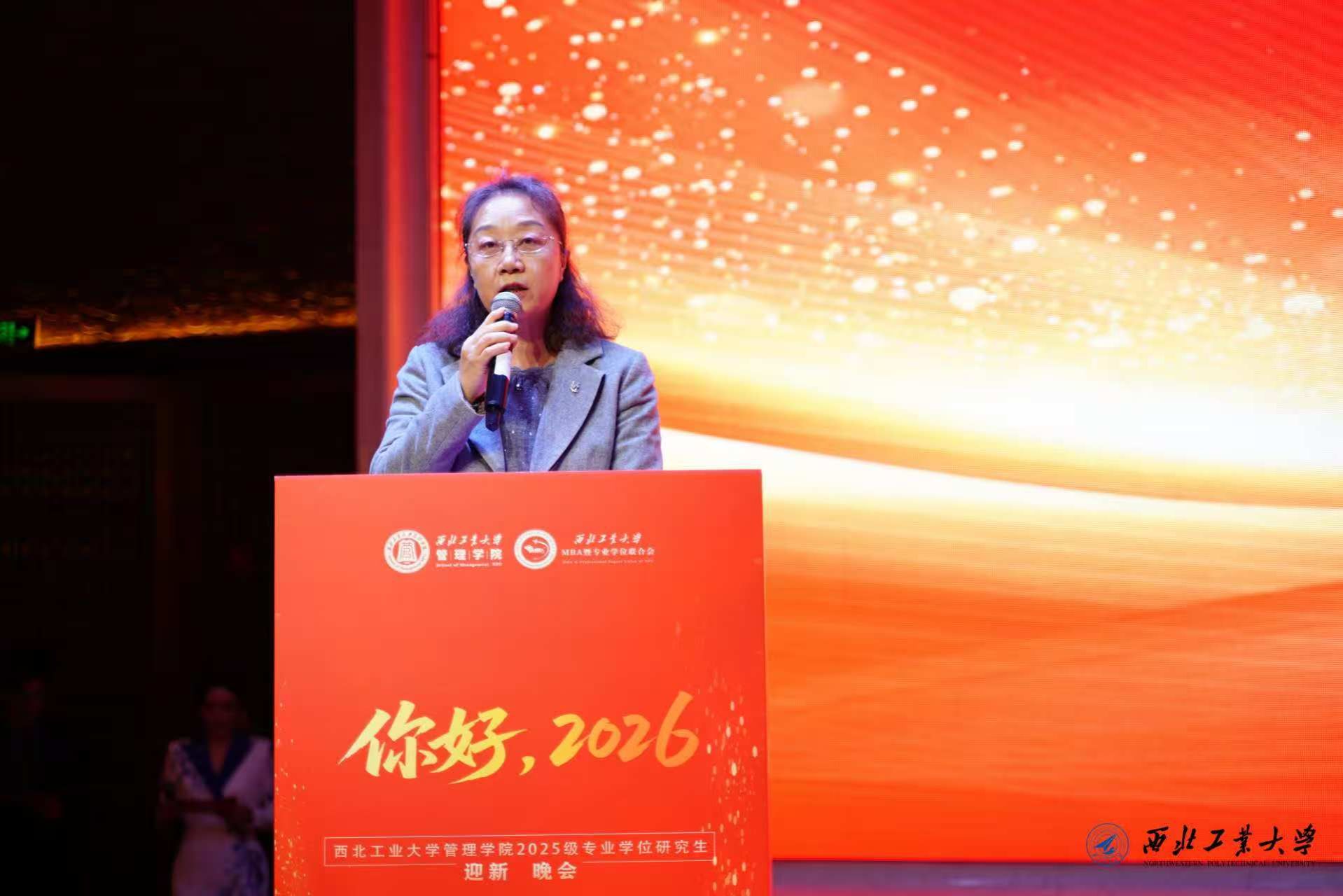 迎新晚会首先由西北工业大学管理学院党委书记张爽致辞。她首先向全体新生致以诚挚的新年祝福,并简要回顾了学院“十四五”期间的跨越式发展。她指出,五年来学院在学科建设、人才培养、科研创新、社会服务与国际合作方面成果丰硕,特别是专业学位教育品牌持续彰显。她勉励2025级新生站在“十五五”新起点上,传承“公诚勇毅”校训,发扬“三实一新”作风,将个人成长融入学院发展与时代浪潮,在崭新的求知征程中砥砺前行,共同谱写管理学院更加辉煌的未来篇章。