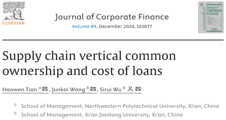 近日,管理学院副教授田皓文作为第一作者的研究成果“Supply chain vertical common ownership and cost of loans”于Journal of Corporate Finance期刊在线刊登。Journal of Corporate Finance是公司金融领域公认的高水平国际期刊,是ABS四星级期刊和JCR一区期刊(影响因子7.2)。